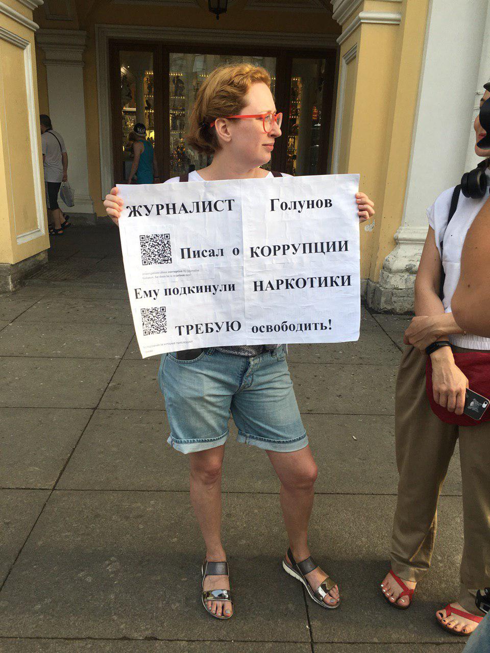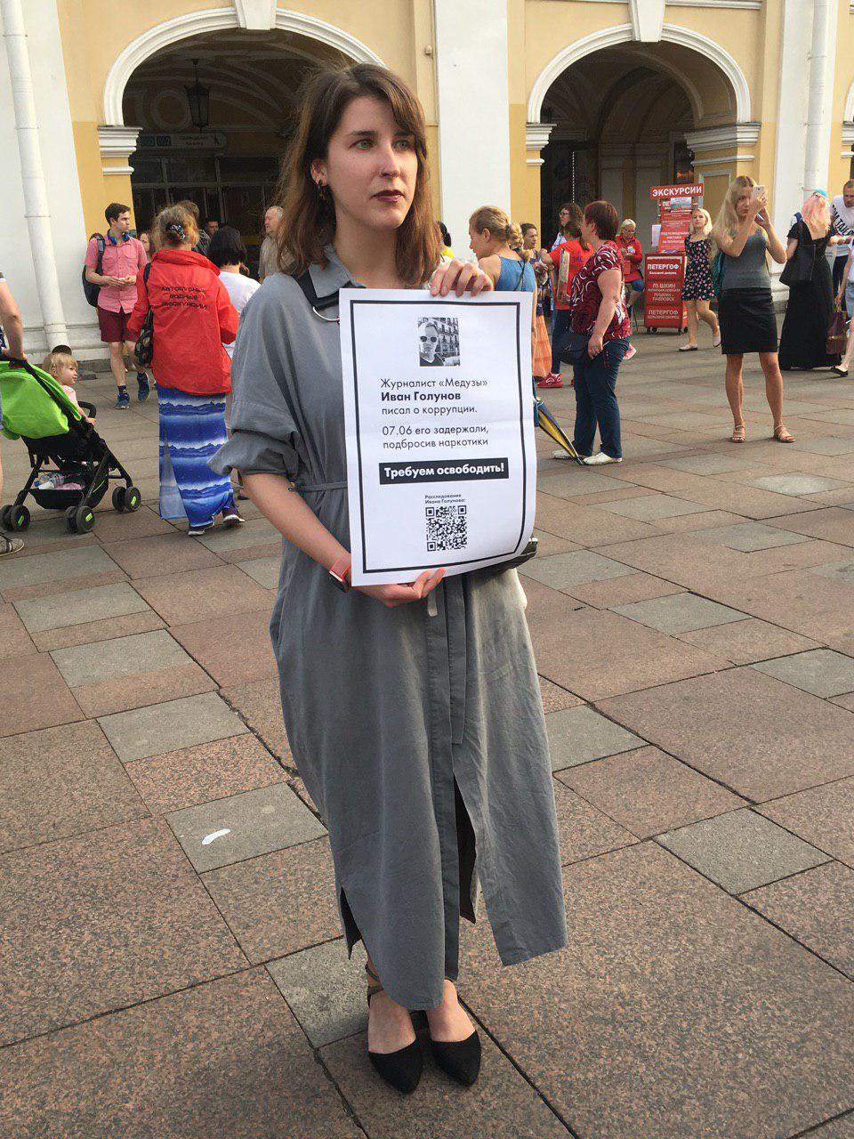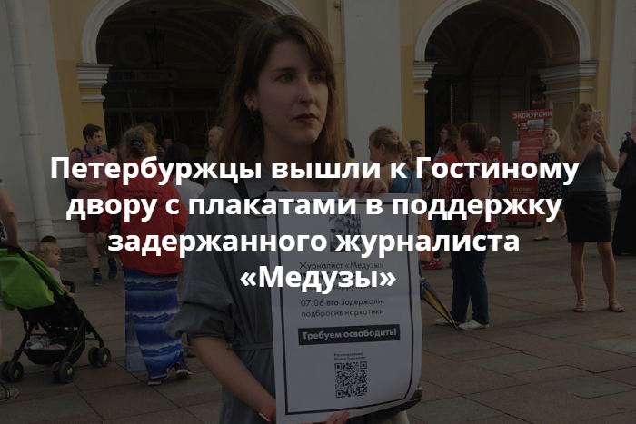 Вечером 7 июня, примерно в 19:00, у Гостиного двора началась акция в поддержку журналиста «Медузы» Ивана Голунова, задержанного по делу о сбыте наркотиков. Люди вышли с одиночными пикетами о несправедливостях дела.