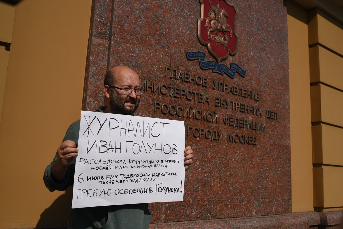 Вечером 7 июня в Москве у здания управления МВД России по Москве начались одиночные пикеты в поддержку журналиста «Медузы» Ивана Голунова, задержанного по делу о сбыте наркотиков.