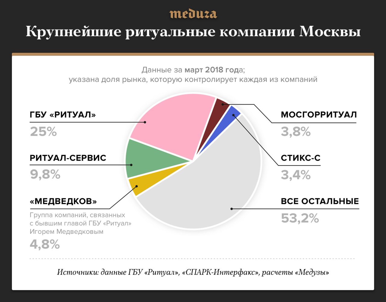 В неформальный холдинг, связанный с Медведковым, по подсчетам «Медузы», входит более 30 юридических лиц. Вместе они по состоянию на начало 2018 года контролировали около 6% всех захоронений в Москве. Полный список основных игроков московского ритуального рынка, составленный «Медузой», можно посмотреть здесь.