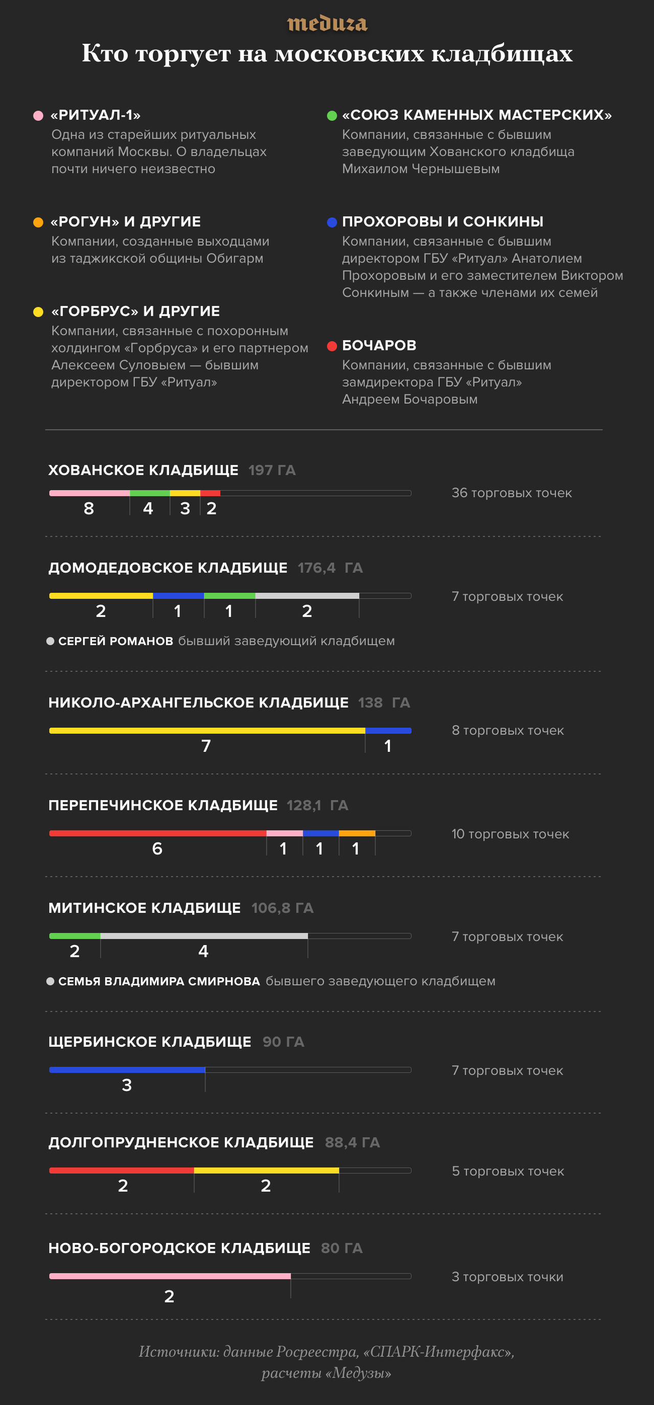 Наибольшая торговая конкуренция — на крупнейшем кладбище Москвы, Хованском, где работает более 35 точек. Две из них принадлежат Игорю Дашдамирову, которого связывали с Солнцевской ОПГ и задерживали по подозрению в убийстве телеведущего Влада Листьева. Крупнейший же здешний торговец — «Ритуал-1», одна из старейших компаний рынка, которая до сих пор является заметным продавцом ритуальных товаров и гранитных памятников. О владельцах «Ритуал-1» известно немного. Среди них — православная меценатка Вера Слепухина и уроженец Солнцево Павел Руднев, который вместе с федеральным МВД продюсирует документальные фильмы и художественные сериалы про полицейских.