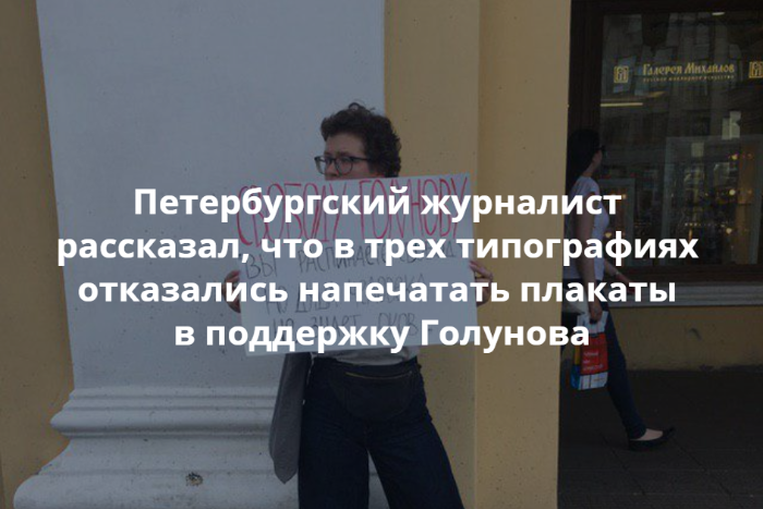 Шеф-редактор сайта «Новой газеты» в Петербурге Серафим Романов рассказал, что в трех типографиях отказались напечатать плакаты для акции в поддержку Ивана Голунова. Пикеты пройдут сегодня в 19 часов.