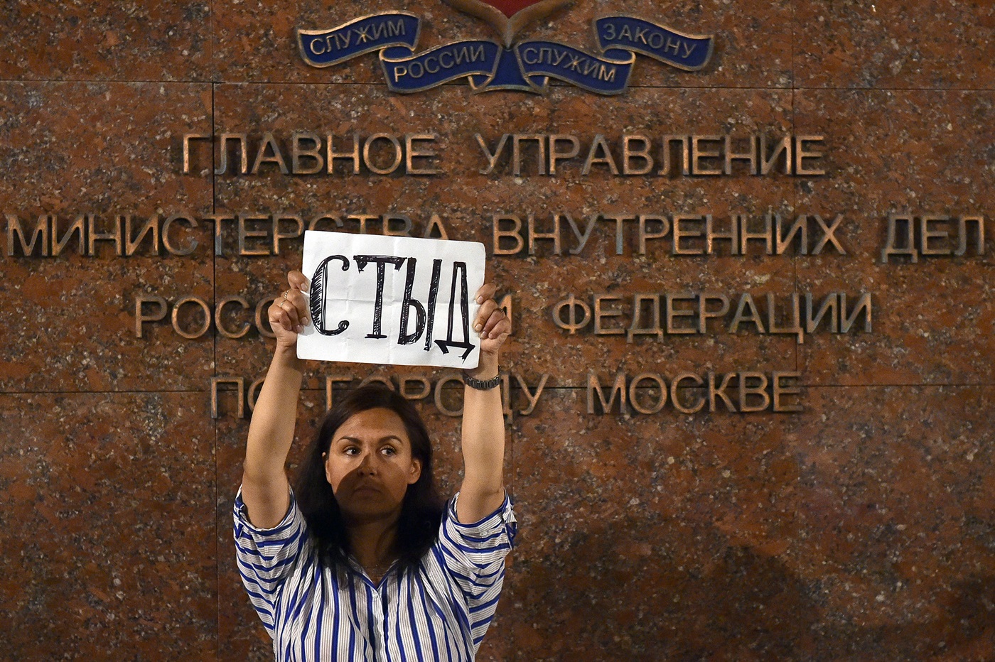 Одиночный пикет против задержания Ивана Голунова у здания ГУМВД по городу Москве. Фото: Иван Водопьянов / «Коммерсант»