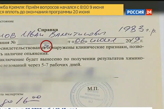 На канале «Россия 24» заявили, что Иван Голунов при задержании был в состоянии опьянения. И показали в эфире документ, опровергающий это