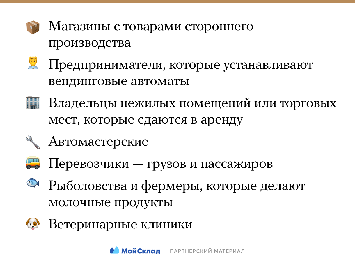 Касается индивидуальных предпринимателей на патенте и ЕНВД, которые принимают оплату от физических лиц. Ранее на онлайн-кассы были переведены и другие группы предпринимателей По закону с первого июля в России не должно остаться бизнесов, даже самых маленьких, которые могут вести дела без чеков и онлайн-касс. Отсрочка до 2021 года действует только для узкого круга индивидуальных предпринимателей. Например, для тех, кто продает товары, сделанные своими руками (скажем, одежду или выпечку), а также оказывает некоторые услуги (например, чинит технику или дает уроки английского языка). Всем остальным придется перейти на онлайн-кассы. На этом можно сэкономить: сервис «МойСклад» продает онлайн-кассы со скидками, а еще помогает быстро их подключить. Кроме того, у него есть тариф для микробизнеса, он бесплатный.