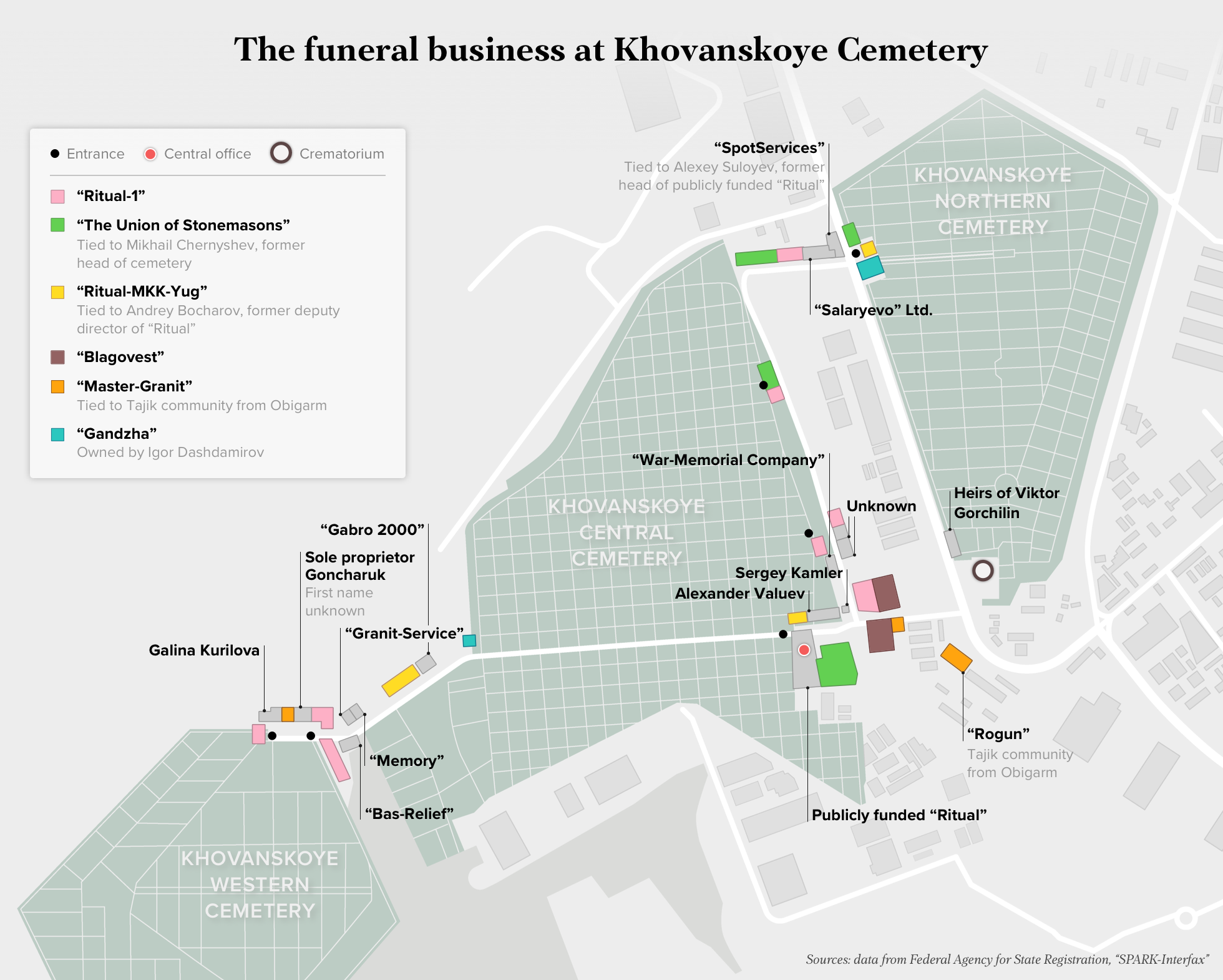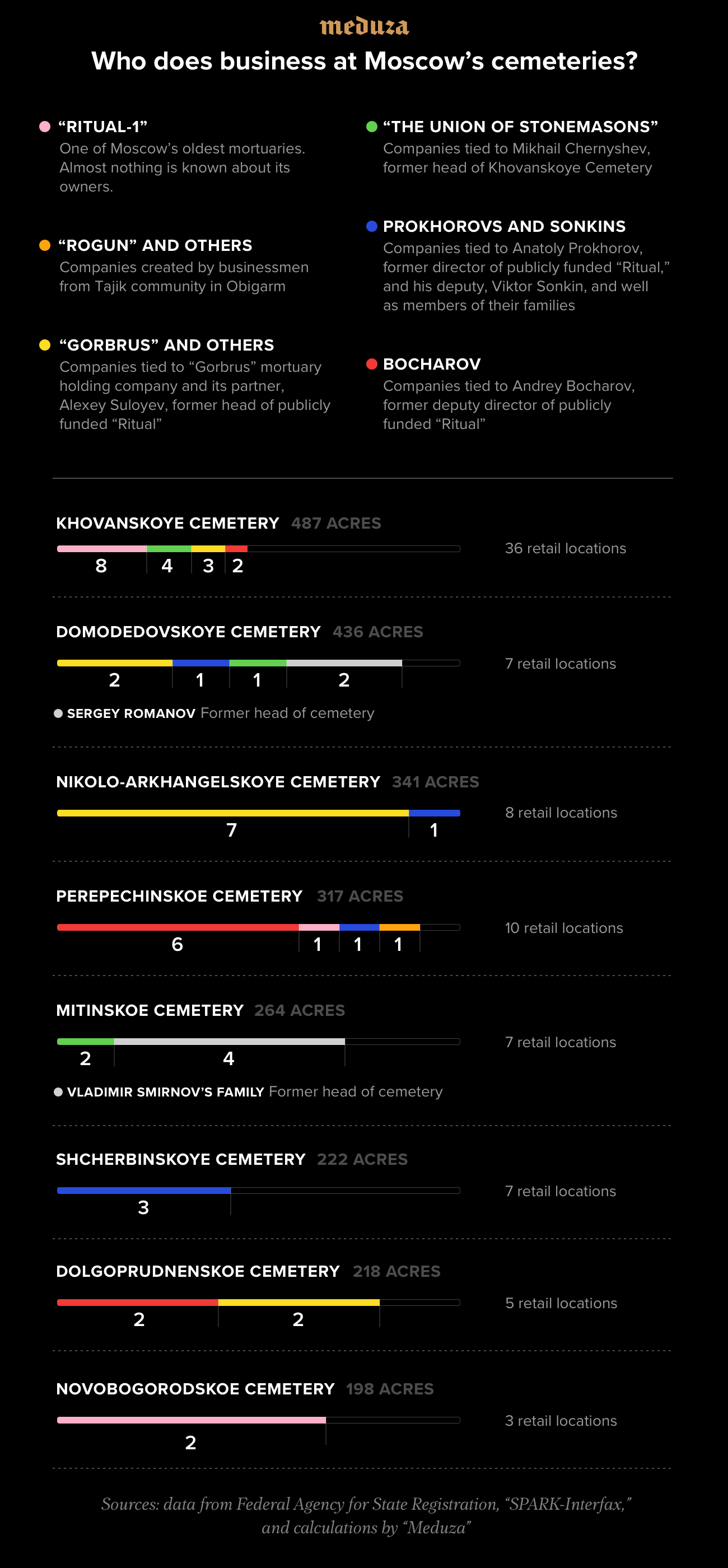 Another important asset in Russia’s funeral industry are retail locations at cemeteries. As Meduza’s investigation shows, the most attractive sites for this business belong to people affiliated with former cemetery managers and ex-officials from Ritual.