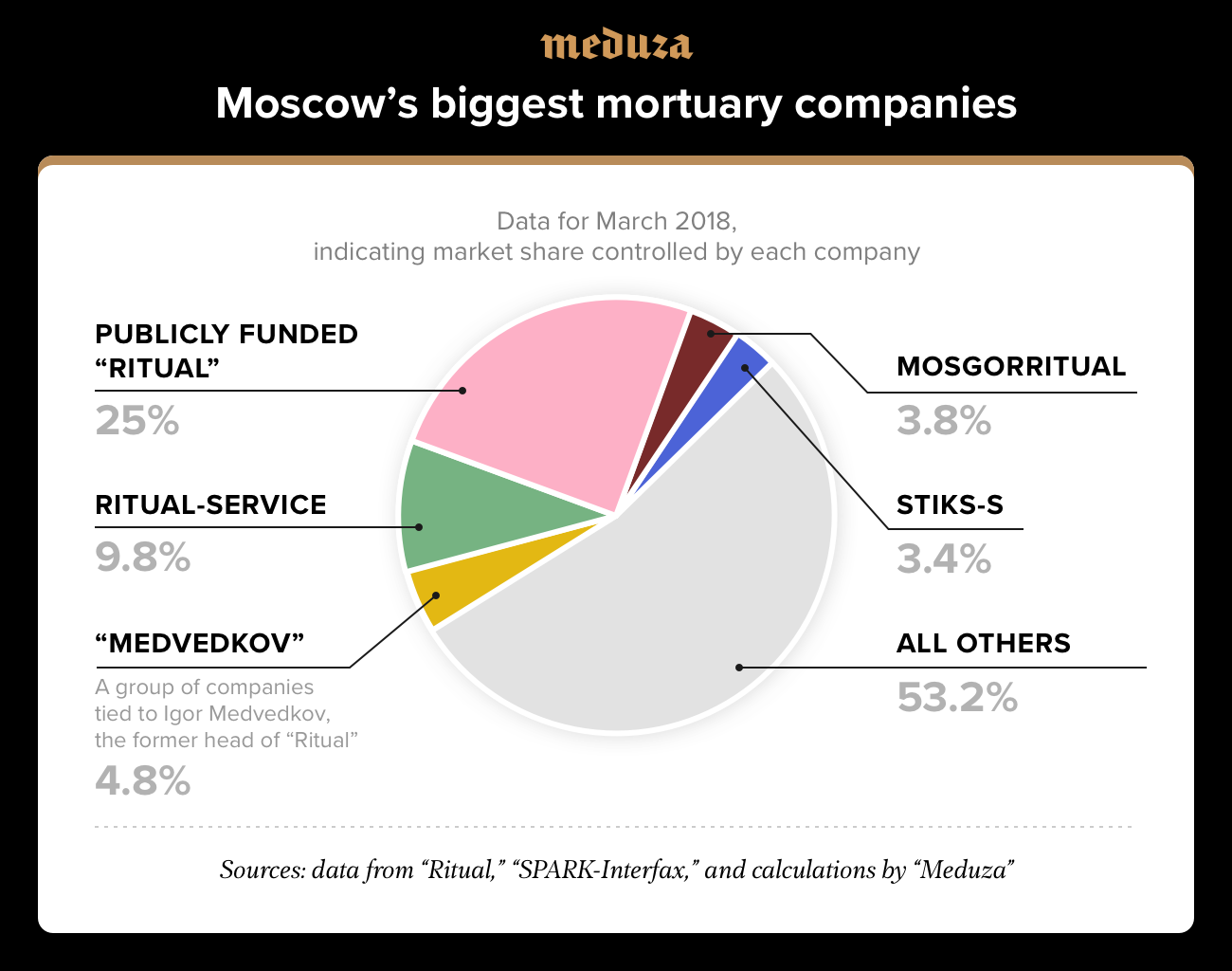 Based on Meduza’s calculations, the informal holding group tied to Igor Medvekov includes more than 30 legal entities. As of early 2018, together they controlled about six percent of all burials in Moscow. You can find a full list of all the main players in Moscow’s funeral market, compiled by Meduza, here in Russian.