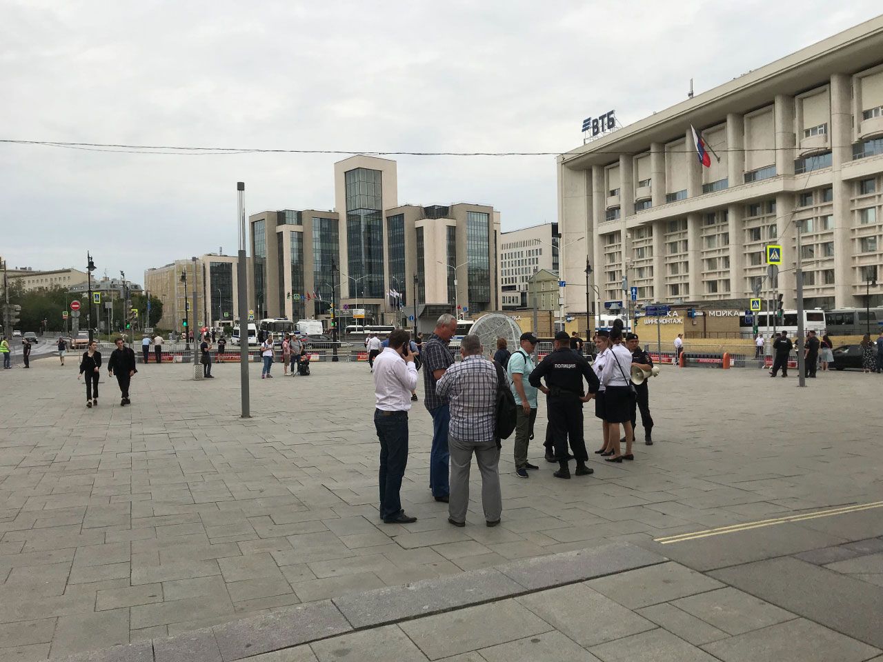 «Собрание не согласовано с органами исполнительной власти, расходимся, не стоим, не задерживаемся, не мешаем проходу других граждан», — объявляет полиция на площади около метро.