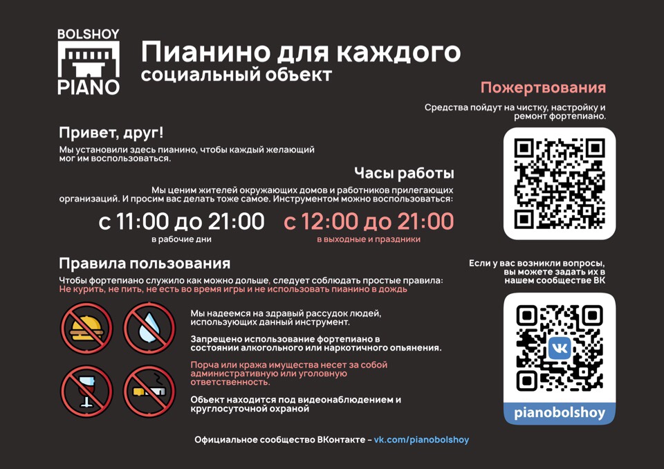 Филиппов и Берсекер создали группу во «ВКонтакте», в которой собирают деньги на чистку, ремонт и настройку пианино, а также рассказывали о правилах пользования инструментом.
