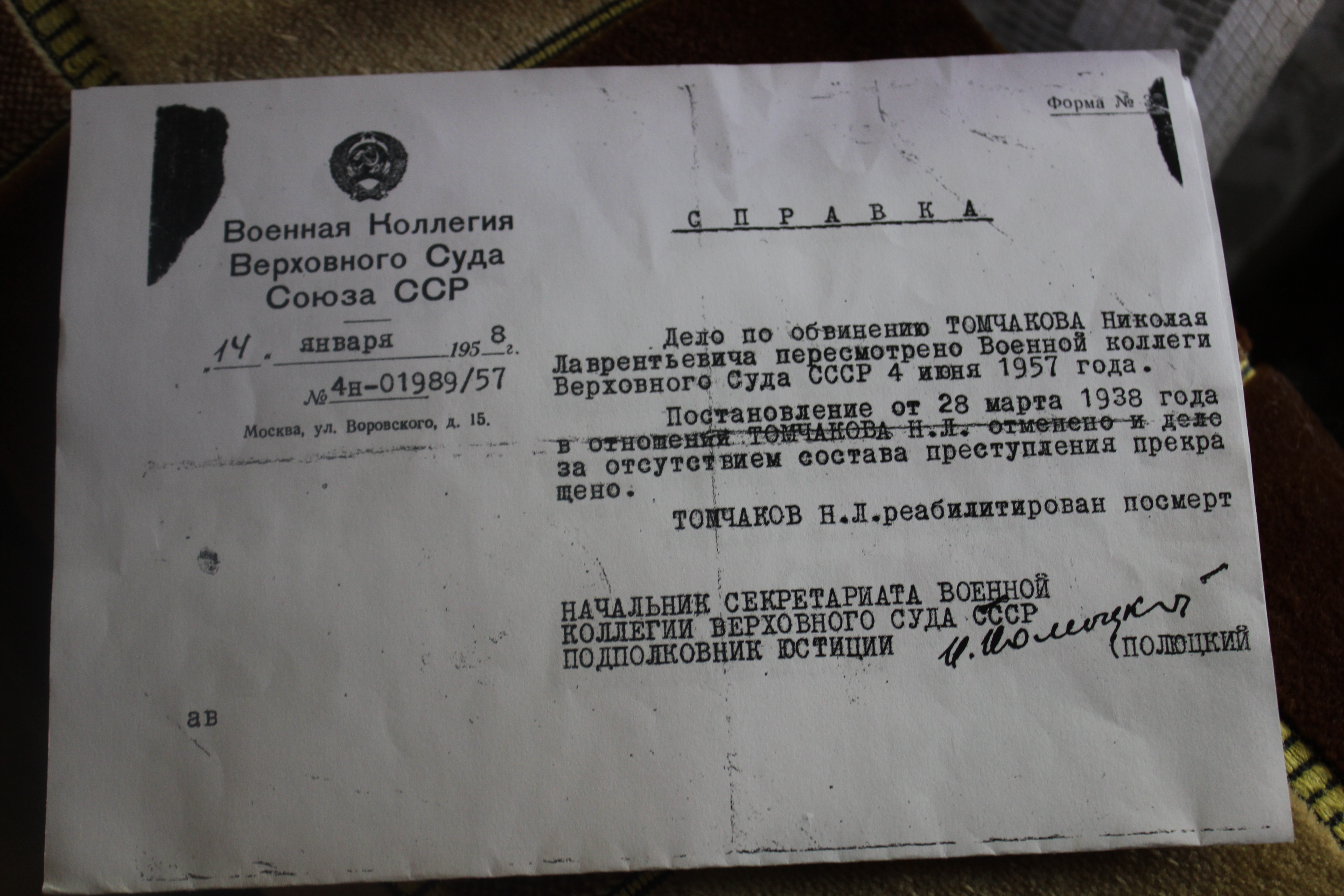 Много лет спустя Галину Кочину пригласили в КГБ и дали дело ее отца, Томчикова Николая Лаврентьевича. Она все переписала в блокнот.