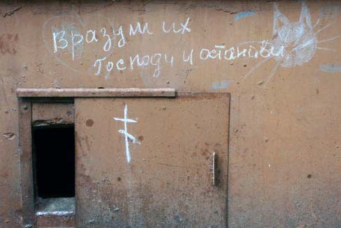 Когда надежды на полицию иссякли, остается надеяться только на высшие силыФото: Татьяна Григорьева Татьяна Кирьянова — человек верующий. Пожилая женщина нарисовала кресты возле подвальных окошек и написала мелом: «Защити нас, Господи!», «Вразуми их, Господи, и останови» и прошла с крестным ходом вокруг домов.