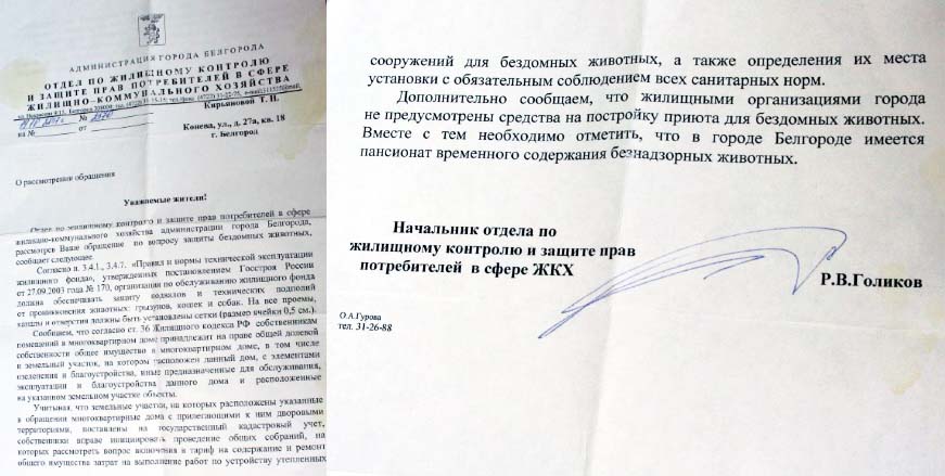 Постановление об отказе в выделении средств на строительство приютаФото: Татьяна Григорьева В этом же законе указано, что нужно принимать меры по предупреждению нежелательного потомства у животных, но кто и как может это сделать, если нет учета количества домашних животных, не определен государственный орган, который обязан вести учет? Собаки и кошки по-прежнему бесконтрольно плодятся, а нерадивые хозяева выкидывают ненужный приплод в соседние дворы. В европейских странах проще — чуть ли не каждый ваш шаг можно отследить. И при наличии видеокамер во дворе, как мы видим на примере ситуации с дворами на Конева и Буденного, тоже ничего не меняется, потому что стражи порядка не просматривают эти записи даже после заявлений жильцов и массовых отравлений животных. Что уж говорить о поисках людей, которые подкинули кошек?! Закон есть, но я еще не слышал о случаях, когда полицейские поймали хотя бы одного противника стерилизации, который подкинул котят от своей Мурки к соседнему подъезду. Ради принятия данных законов зоозащитникам пришлось митинговать и писать петиции. Теперь, наверное, придется голодать, чтобы эти законы исполнялись.