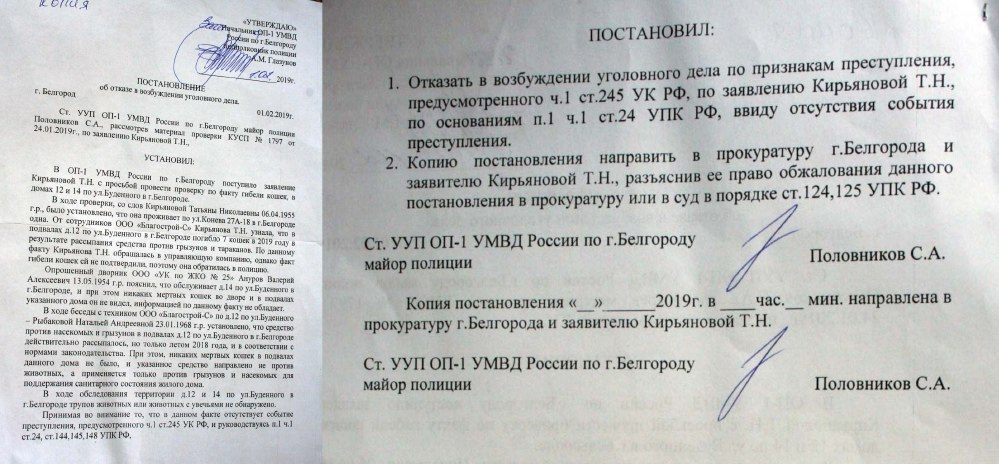 Ответ из полиции в установленный законом десятидневный срок жильцы так и не получили. 4 июня Татьяна Кирьянова, так и не дождавшись письма из УМВД, пришла к участковому и забрала постановление об отказе в возбуждении уголовного дела, датированное 27 мая. В ответе значилась уже привычная фраза «ввиду отсутствия события преступления». Участковый сослался на то, что жильцы лично не видели, кто отравил кошек.