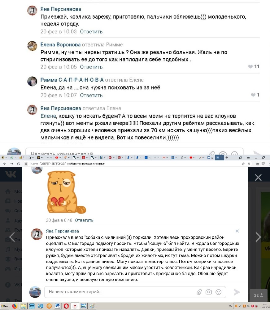 Комментарии многодетной матери Яны Персияновой, которую волонтеры обвинили в выбрасывании кошки на морозФото: скриншот из одной из групп в соцсети О случившемся волонтеры написали в одной из групп в соцсети. Яна тоже оставила свои комментарии. Многодетная мать написала, что жена одного из полицейских долго смеялась, когда муж рассказал о волонтерах, вызвавших полицию: «Вот менты ржали вчера!!! Поехали другим ребятам рассказывать, как два очень хороших человека приехали за 70 км искать кашуню» (орфография источника сохранена. — Прим. ТД), а потом еще добавила: «…Девки, приезжайте, у меня тут весело. Берите ружья, будем вместе отстреливать бродячих животных, их тут тьма. Можно потом шкурки выделывать…»
