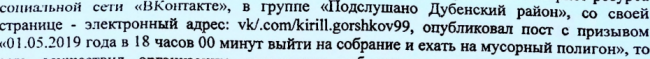Власов говорит, что Горшков не призывал никого не акцию — в чате на 235 человек обсуждались форматы, в которых можно ее провести. Например, субботник или демонстрация. В ходе этого обсуждения Горшков написал: «Давайте соберемся и поедем на полигон». Ссылку на сам чат экоактивист разместил в паблике «Подсушано», но добавиться в чат можно только с разрешения администратора.