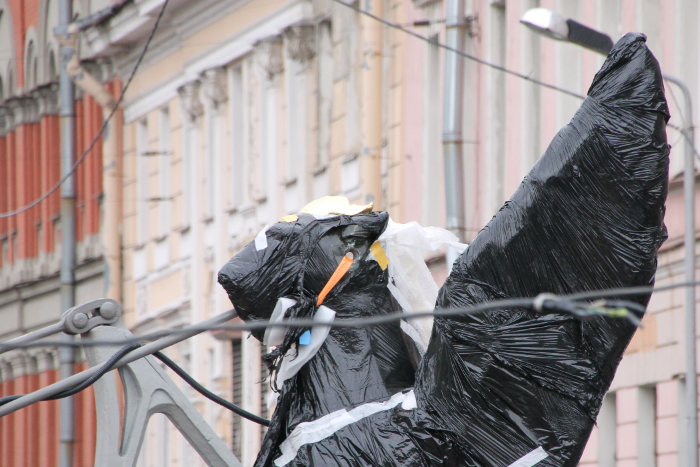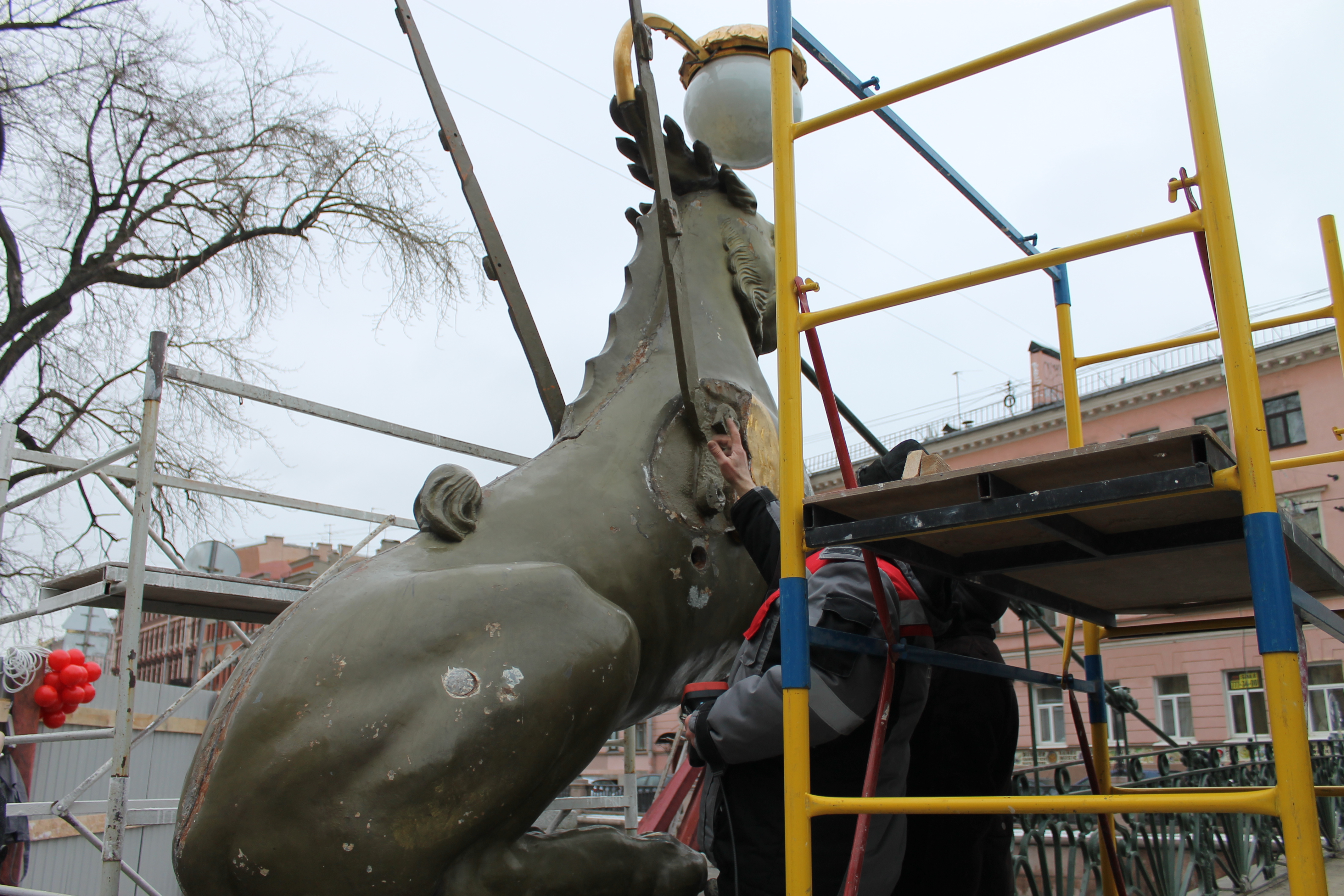 Скульптуры грифонов с Банковского моста отправили на реставрацию в январе 2017 года. Статуи находились в аварийном состоянии: на них появились трещины. Кроме того, их постаменты нужно было очистить от граффити и пятен краски.