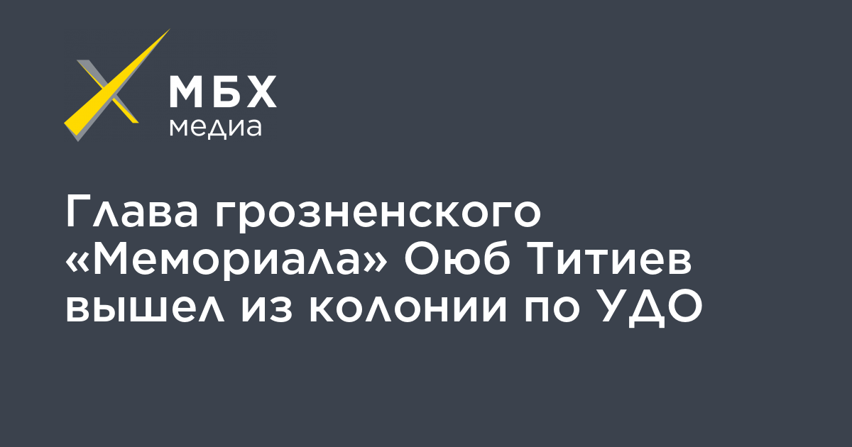 Глава грозненского «Мемориала» Оюб Титиев, которого приговорили к четырем годам по статье о хранении наркотиков, вышел из колонии условно-досрочно. Об этом «МБХ медиа» сообщил руководитель программы «Горячие точки» ПЦ «Мемориал» Олег Орлов.