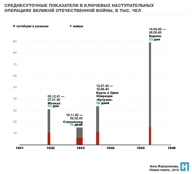 Среднесуточные наши потери в наступлении под Москвой — 10 910 человек, под Сталинградом — 6392, под Курском и Орлом — 11 313.