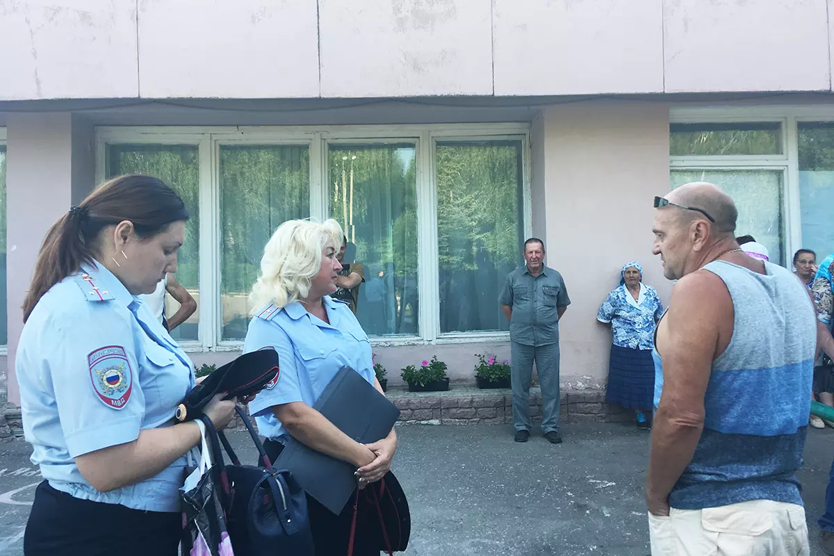 В перепалку с ними вступили двое мужчин, которые пытались убедить полицейских, что «это не митинг, а сход села», и ничего противозаконного они не делают. Сотрудницы полиции, в свою очередь, сообщили самому активному из собравшихся, что он — «организатор митинга, а значит понесет ответственность в первую очередь». Сам мужчина, настаивал на том, что организаторов у схода нет, а он узнал о нем из соцсетей.