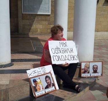 Мать Барзукаева расположилась с плакатами на ступеньках горотдела полиции, а родительница Курбанова Шаганаз в полусотне метров – напротив ОВД.
