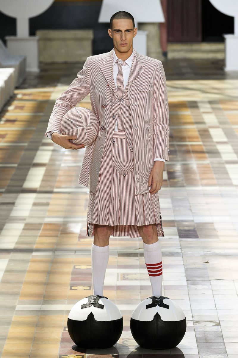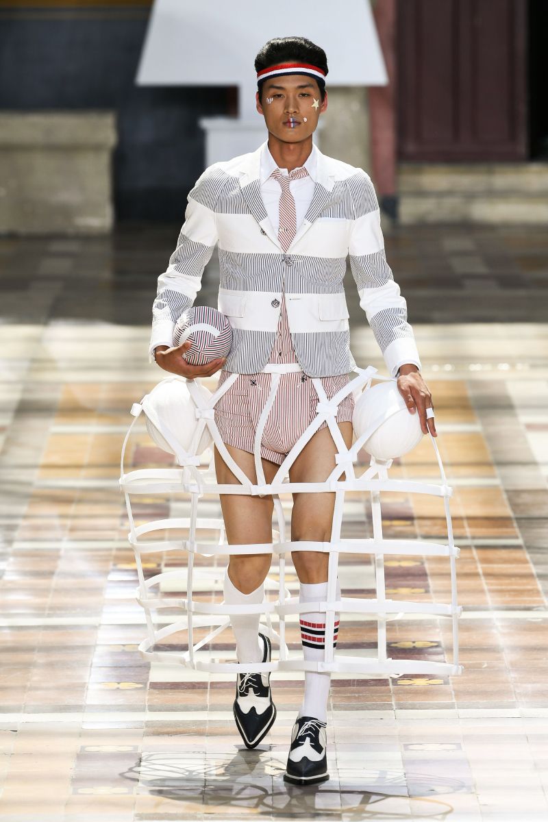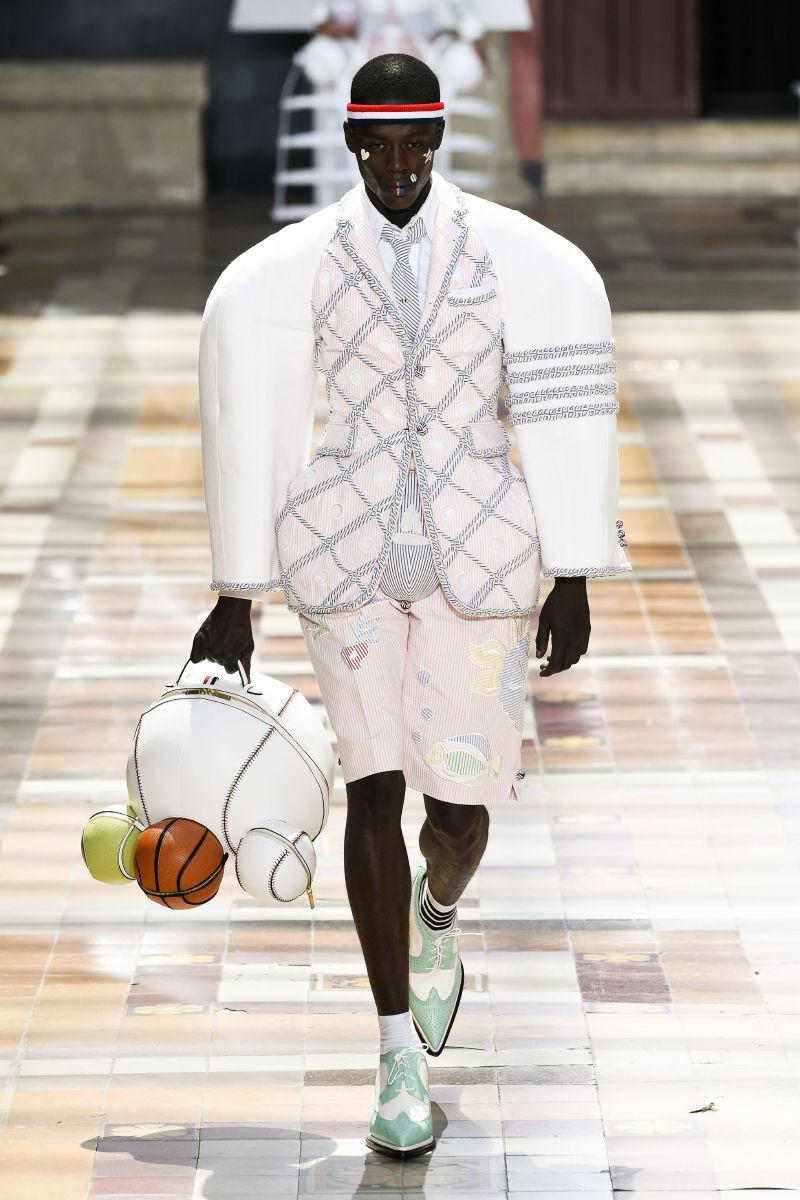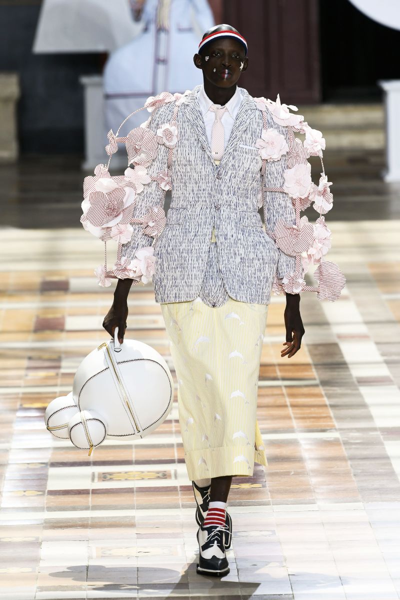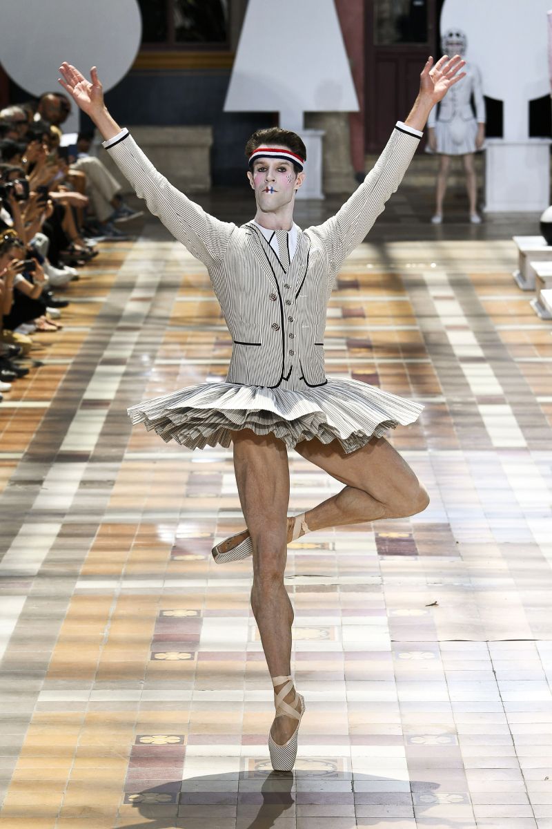 На Парижской неделе моды американский дизайнер Том Браун показал весенне-летнюю коллекцию своего бренда Thom Browne. Модели выходили на подиум в балетных пачках, остроносых ботинках и кринолинах. Образы дополняли объемные сумки в форме баскетбольных мячей и собак.