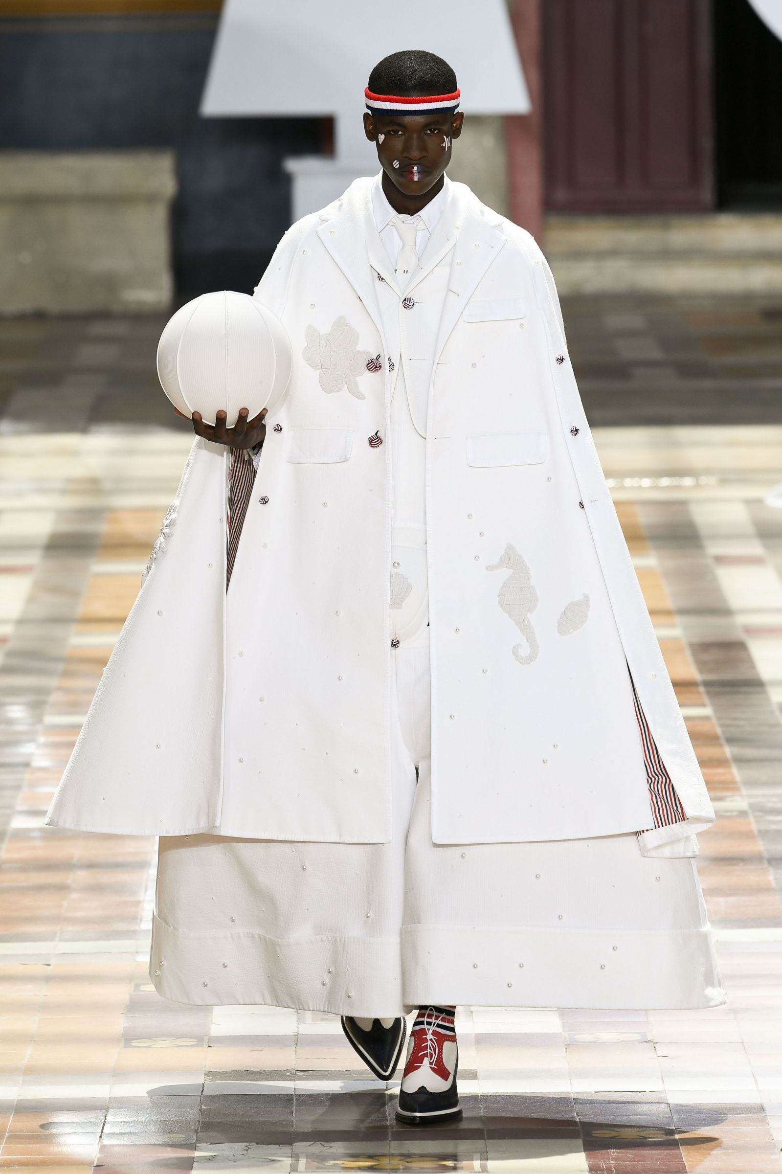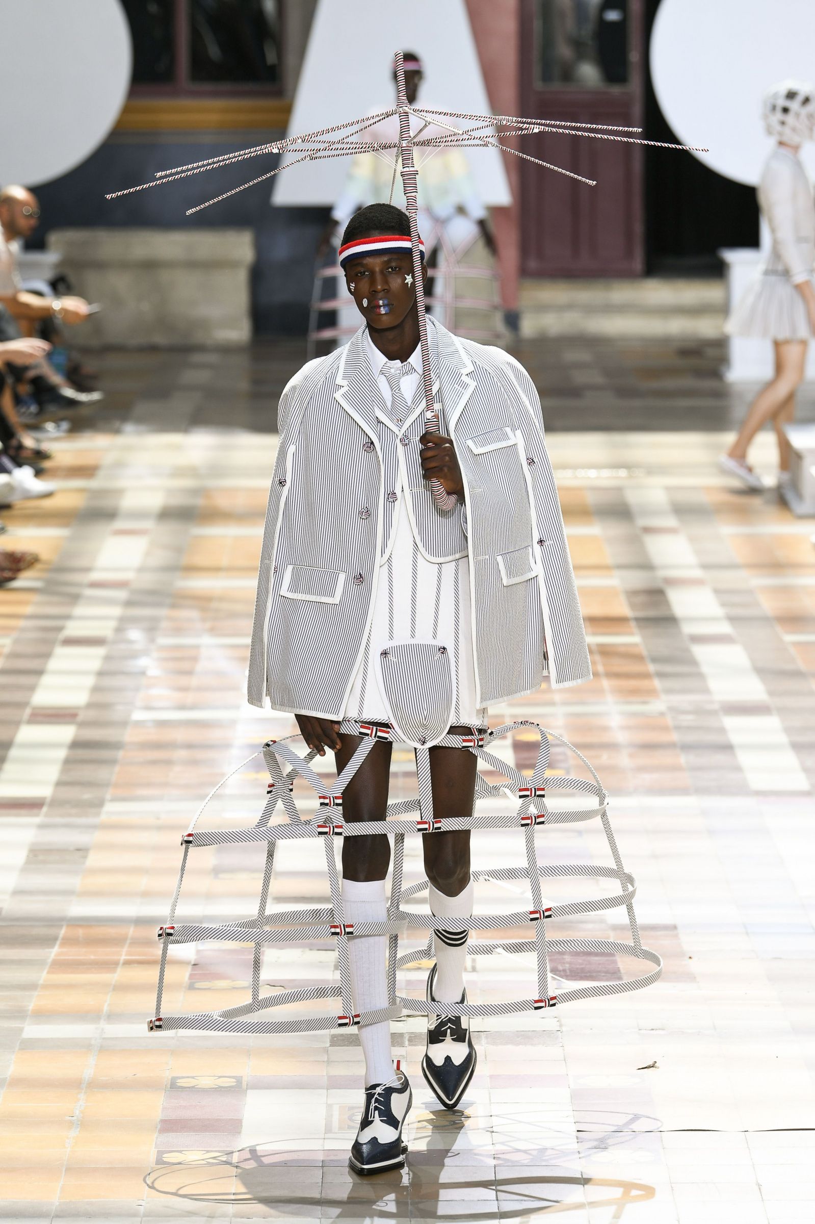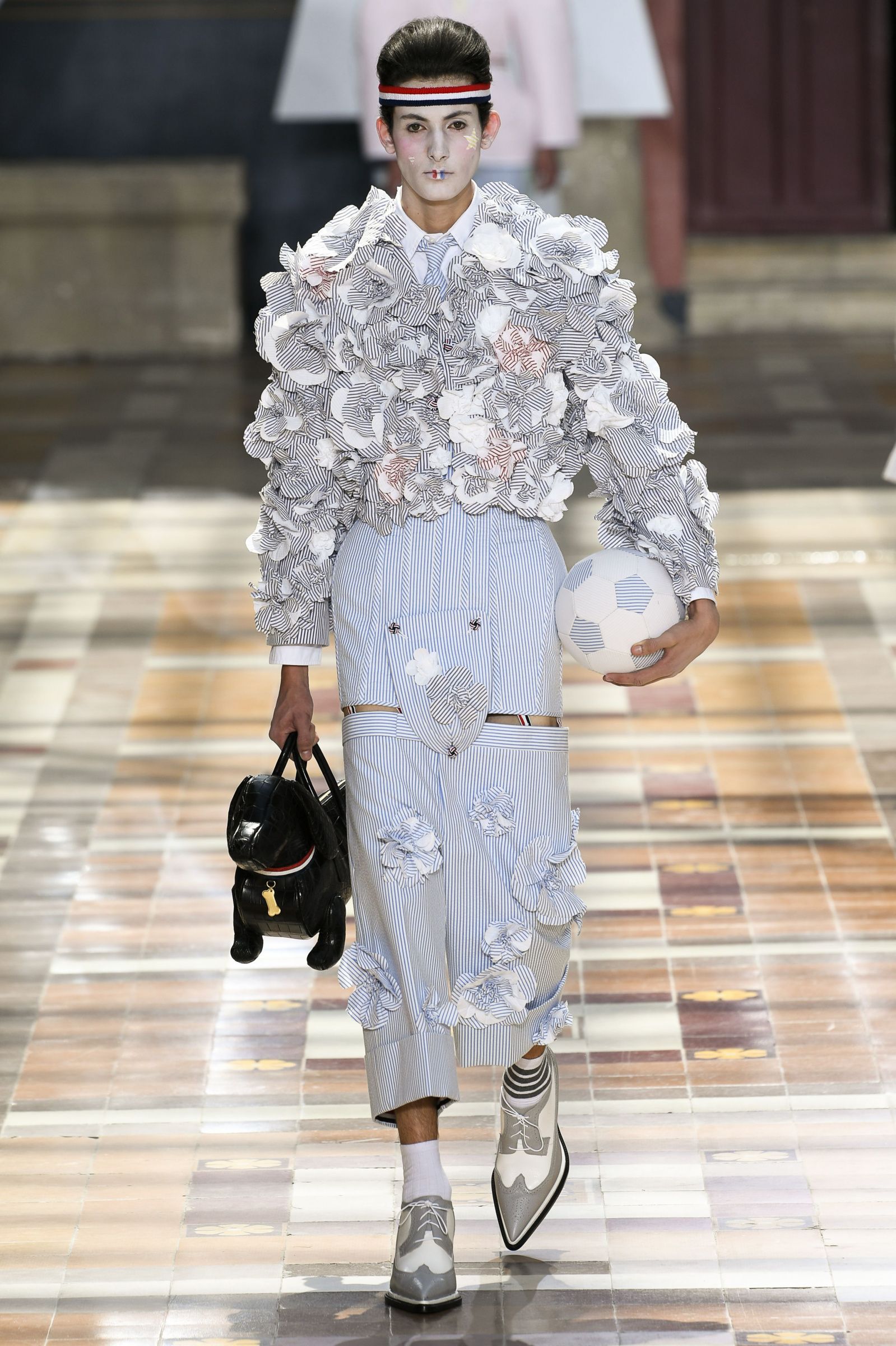 На Парижской неделе моды американский дизайнер Том Браун показал весенне-летнюю коллекцию своего бренда Thom Browne. Модели выходили на подиум в балетных пачках, остроносых ботинках и кринолинах. Образы дополняли объемные сумки в форме баскетбольных мячей и собак.