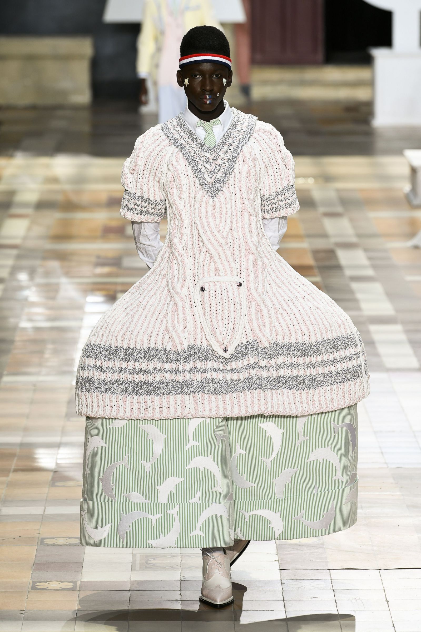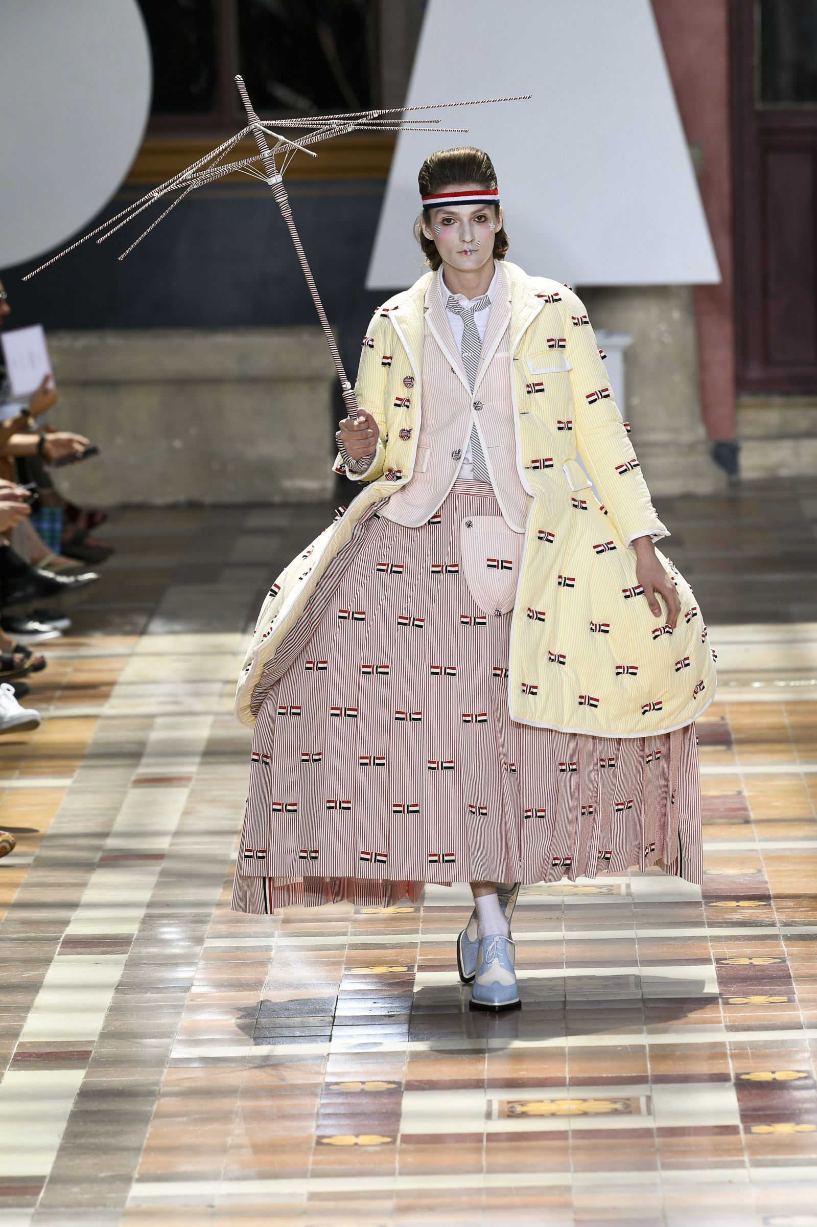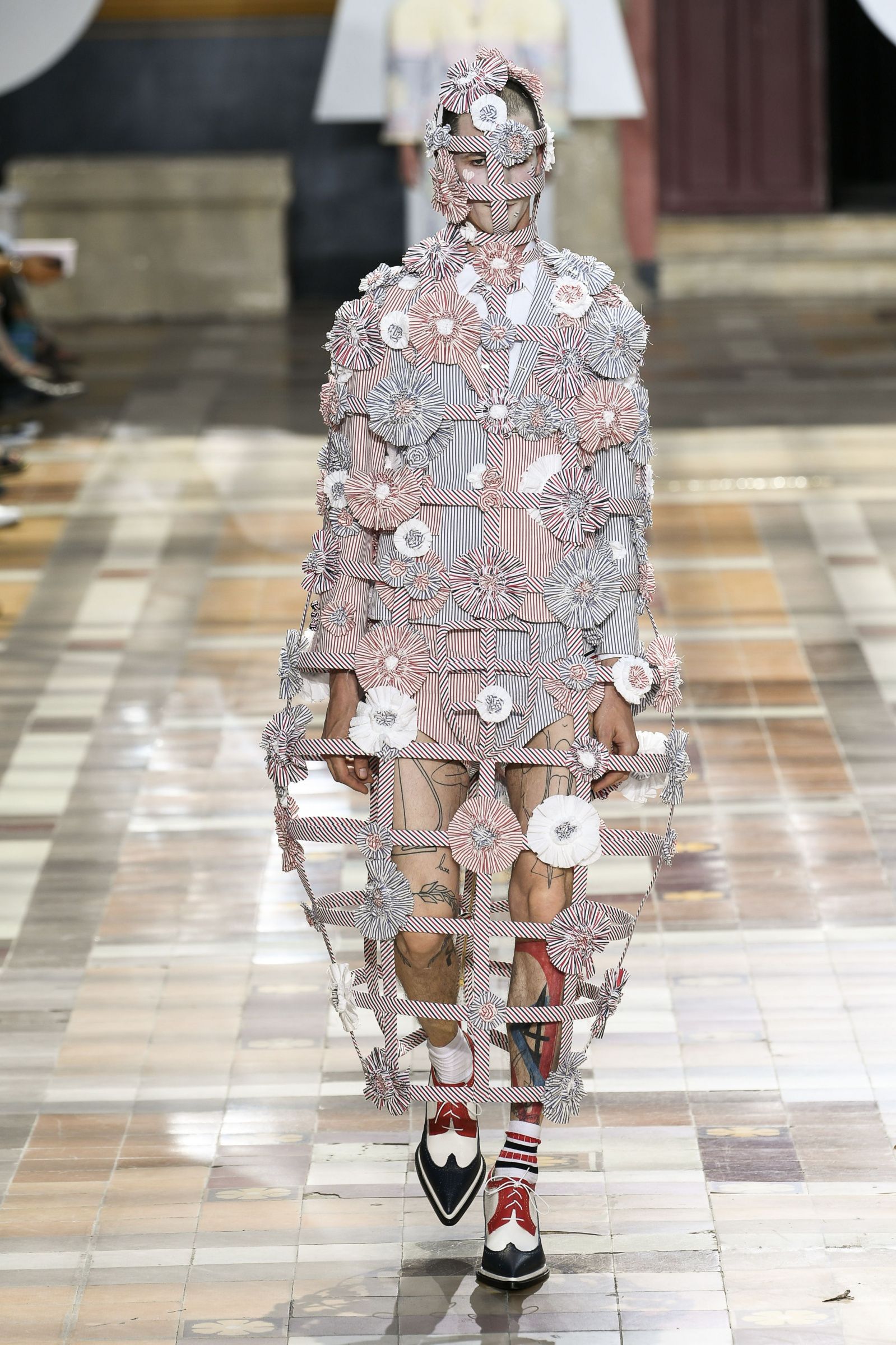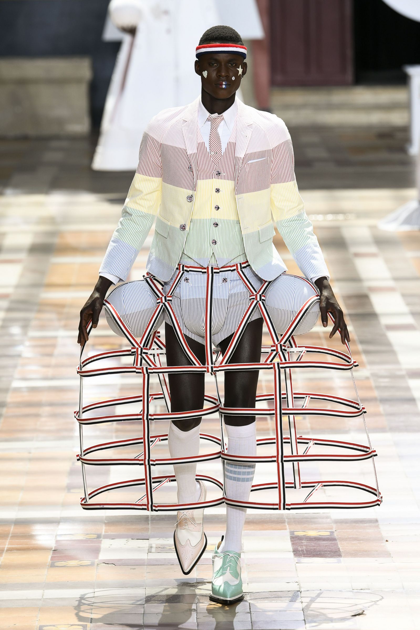 На Парижской неделе моды американский дизайнер Том Браун показал весенне-летнюю коллекцию своего бренда Thom Browne. Модели выходили на подиум в балетных пачках, остроносых ботинках и кринолинах. Образы дополняли объемные сумки в форме баскетбольных мячей и собак.