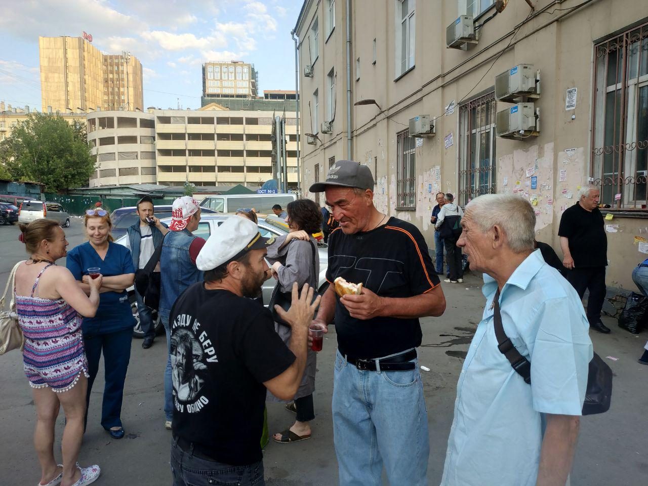 Фестиваль солидарности бездомных прошел 21 июня на привычном для них месте раздачи еды — на пустыре за Ярославским вокзалом. Раньше там стояла палатка «доктора Лизы», перенесенная в преддверии ЧМ-2018 подальше из центра, в Марьино, а теперь работают только благотворительные фонды. На мероприятие пришло около 40 человек — примерно поровну мужчин и женщин разных возрастов и в разных жизненных ситуациях.