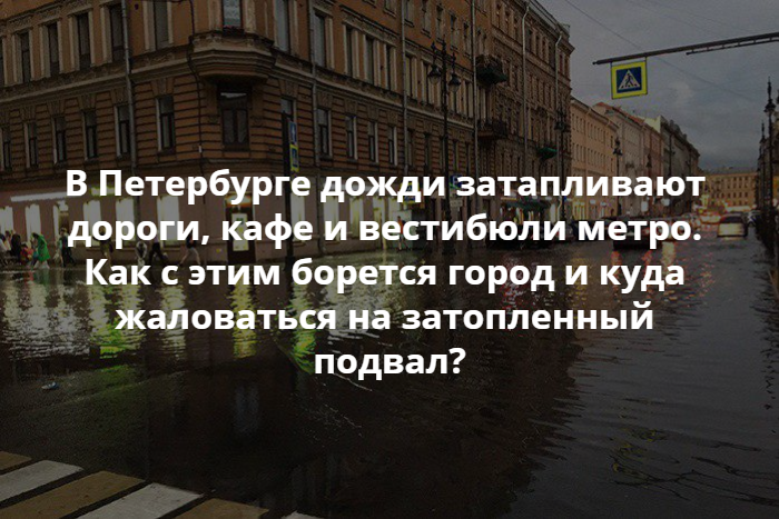 Избежать затоплений помогает регулярное обслуживание и очистка ливневых канализаций от засоров. Часто они образуются прямо во время ливня, и если справиться с ними быстро, последствия будут менее серьезными, считает Каддинс. Затопление дорог, дворов, вестибюлей метро зависит от инфраструктуры города, от количества водоприемных колодцев, диаметра и состояния труб ливневой канализации. Чтобы справляться с последствиями ливней, канализационные люки должны быть возле каждого дома, не дальше 3–12 метров от водостока. В региональных нормативах говорится, что на городской улице расстояние между колодцами не может превышать 60 метров. Также лужи образуются при нарушении нормативов или отсутствии надлежащего ухода за дренажными системами. В обычных условиях вода, в зависимости от объема выпавших осадков, испаряется или впитывается в землю от нескольких часов до нескольких дней. Почти 70 % канализаций в центральных районах Петербурга — общесплавные: туда поступают хозяйственно-бытовые, промышленные, дождевые и талые воды. Остальные 30 % — районы новостроек и пригороды, там дождевые и талые воды собираются отдельно от остальных стоков. В таких районах больше газонов и открытого грунта, поэтому часть воды впитывается туда. И хотя в новых районах города открытого грунта больше, колодцев там меньше. А в центральных районах наоборот, поэтому там нагрузка на колодцы увеличивается и последствия ливня зависят от их состояния.А как в Петербурге борются с последствиями ливней?