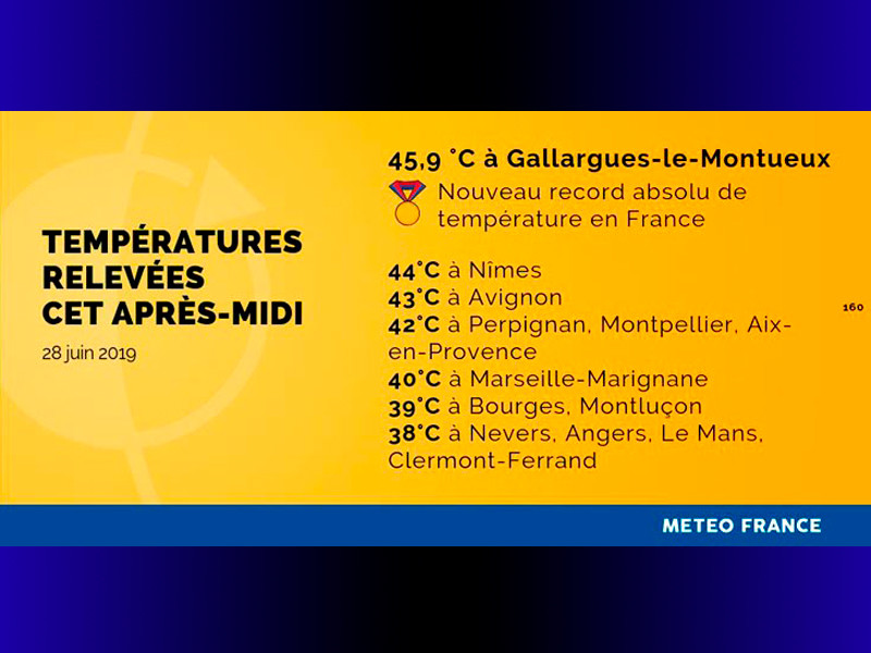 #Canicule Des températures très élevées relevées cet après-midi sur une large partie du pays. Le record absolu (tous mois confondus) de température en métropole a été battu : 45,9°C relevés à 16h21 à Gallargues-le-Montueux pic.twitter.com/kaTp1gbOl4