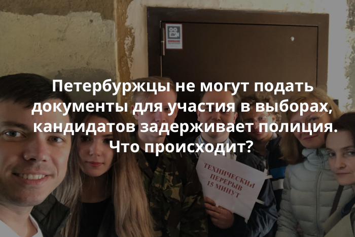В разных районах петербуржцам не удается подать документы для участия в муниципальных выборах. Некоторые дежурят у комиссии с 6 утра — и всё равно не успевают попасть в нее до закрытия. По их словам, одна из проблем — очереди «фейковых кандидатов». Иногда к избиркомам приезжает полиция: например, в МО «Екатерингофский» она задержала двух кандидатов, а на следующий день перекрыла вход якобы из-за сообщения о минировании.