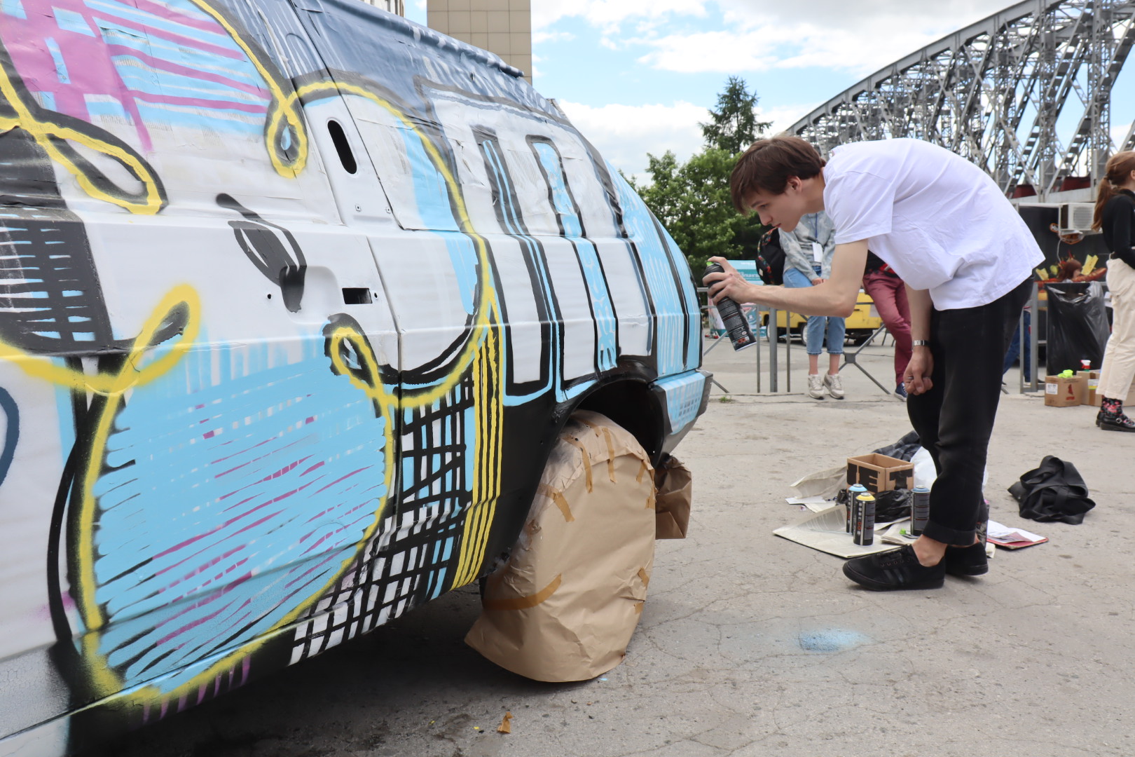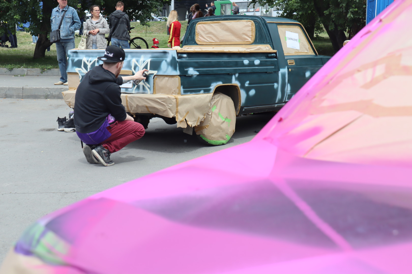 "Разница работы с кузовом автомобиля, в отличие от стены, только в том, что его нужно хорошо подготовить, но в целом это тот же металлический гараж, только объемный. Не квадратный, а какая-то объемная штука, у которой есть разные по форме элементы", – рассказал один из организаторов фестиваля Иван Ягода.