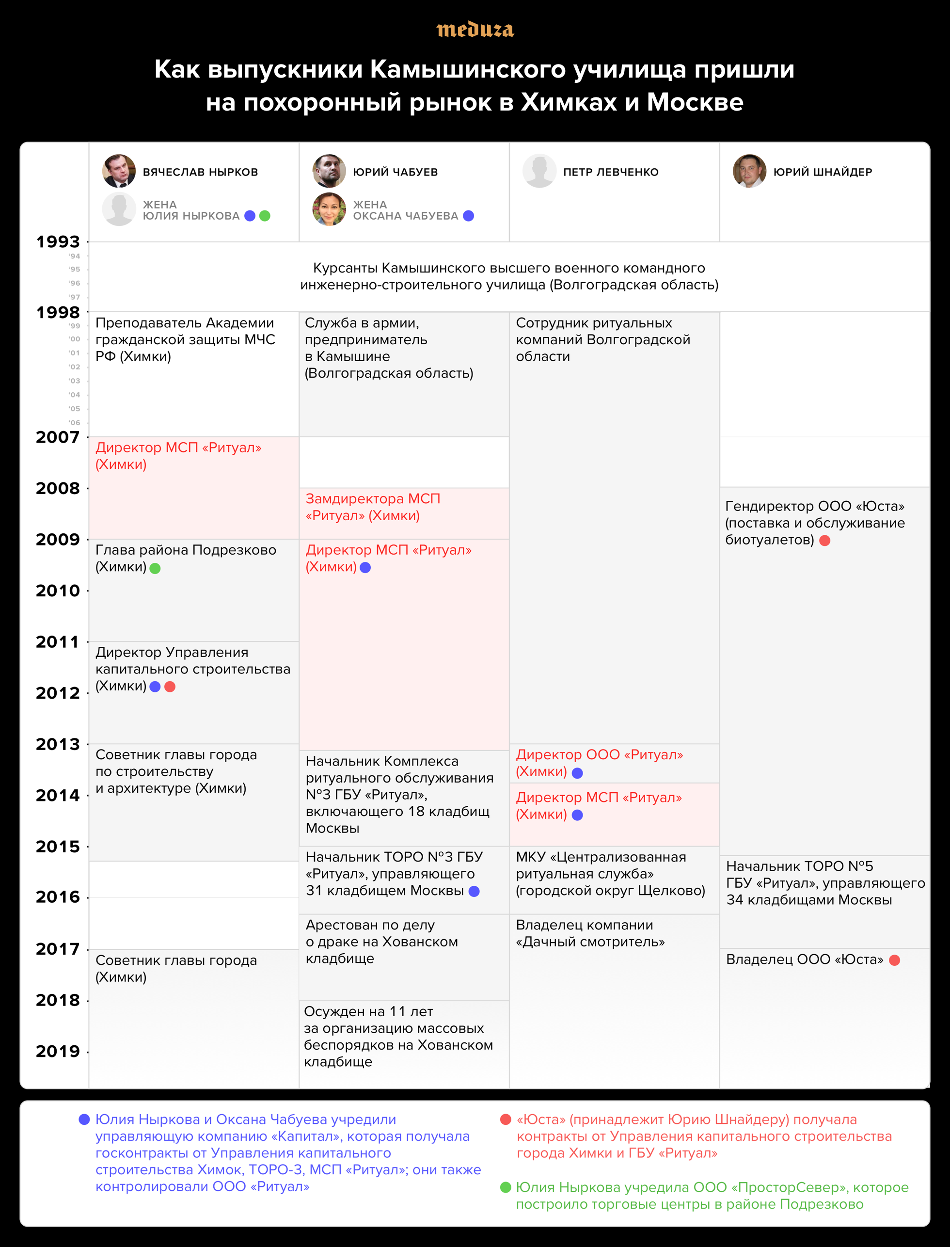 Два года спустя ТОРО №3 расширилось — в него включили ряд знаменитых московских кладбищ, в том числе Троекуровское, Ваганьковское и Новодевичье, — и стало крупнейшим подразделением ГБУ «Ритуал». Под контролем Чабуева оказалось 31 кладбище, включая самые престижные. Однокашник Чабуева и бизнес-партнер по «Чистому городу» Юрий Шнайдер вскоре возглавил ТОРО №5, включающее еще несколько крупных кладбищ на юге Москвы — Щербинское, Домодедовское, Котляковское. Таким образом, выпускники Камышинского училища из Волгоградской области распространили свое влияние на лучшие кладбища Москвы.