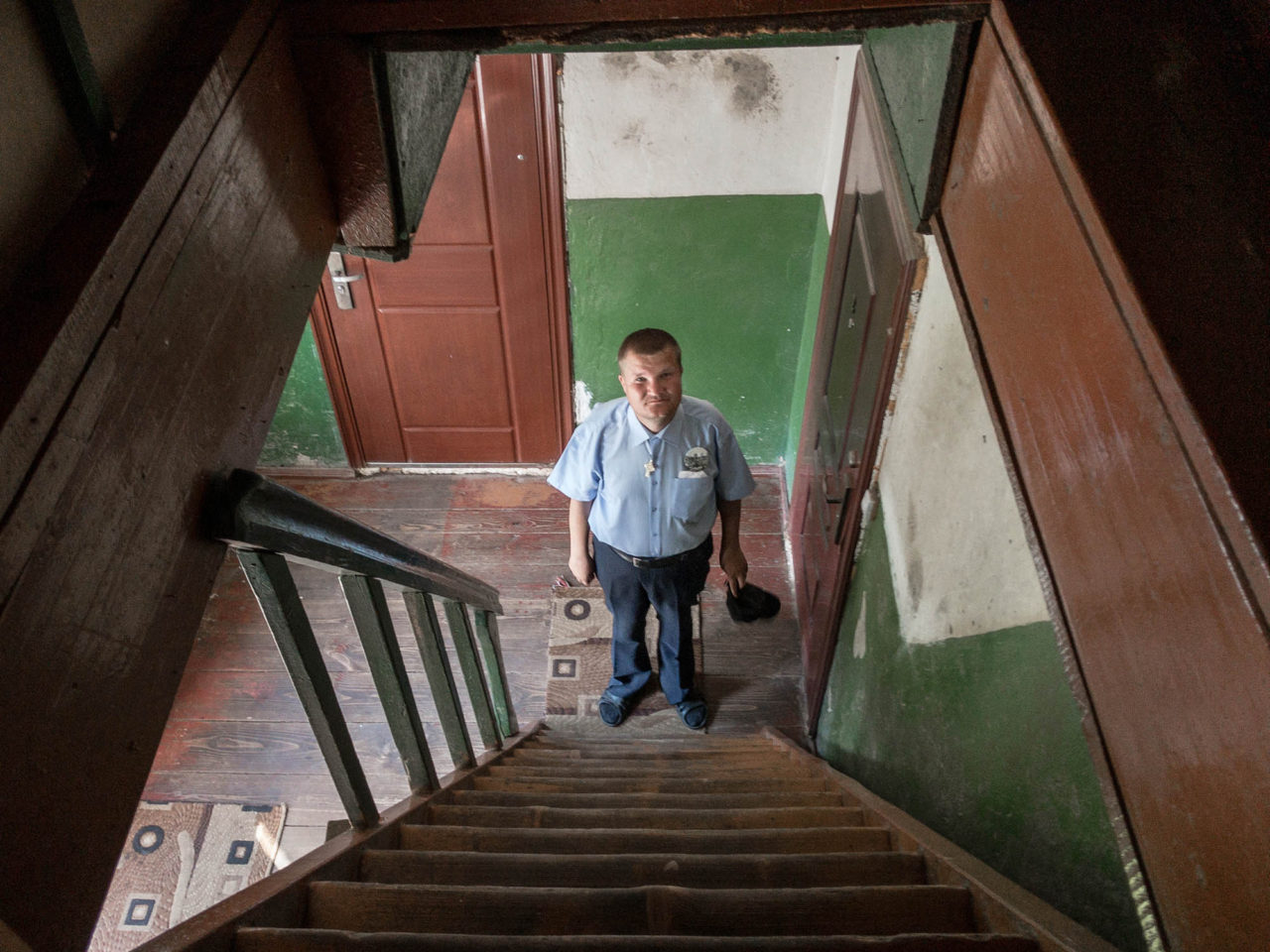 Женя в подъезде своего домаФото: Дмитрий Марков для ТД «Я как-то возился с машиной, увидел его во дворе — разговорились, — вспоминает печорянин Анатолий Харченко, которого Женя называет другом. — На него все смотрят как на дурачка, а он очень адекватно общается, отвечает на вопросы, рассказывает о планах. Я его угощаю иногда чем-нибудь, выслушиваю. Рад, если это помогает».