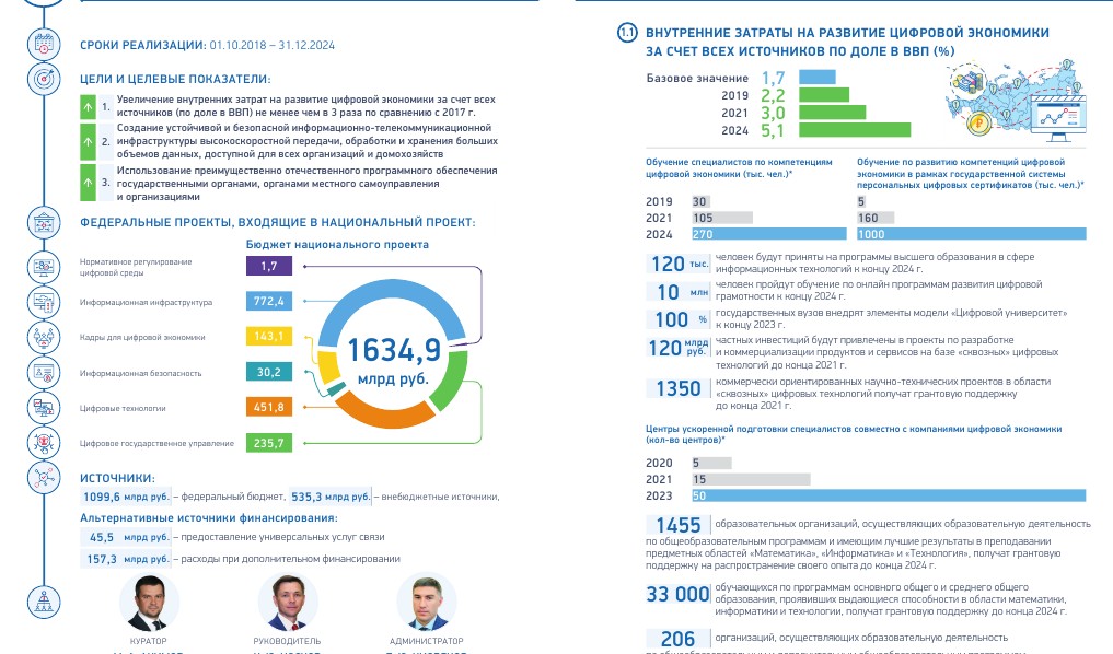 Национальный проект реализуется начиная с текущего года до конца 2024 года. Задача проекта – упростить взаимодействие граждан и государства, внедрить новые отечественные технологии. В частности, планируется разработка и внедрение отечественного программного обеспечения для госслужащих, формирование единого комплекта программ для чиновников, подключение всех, в том числе сельских государственных и бюджетных учреждений к широкополосному интернет-соединению, развитие информационной инфраструктуры. Региональные власти также примут активное участие в реализации проекта. В рамках проекта планируется внедрить повсеместную биометрическую идентификацию, расширить использование цифровой подписи для обращения в государственные органы. В паспорте нацпроекта указано, что ежегодно на данные цели будет увеличиваться финансирование.