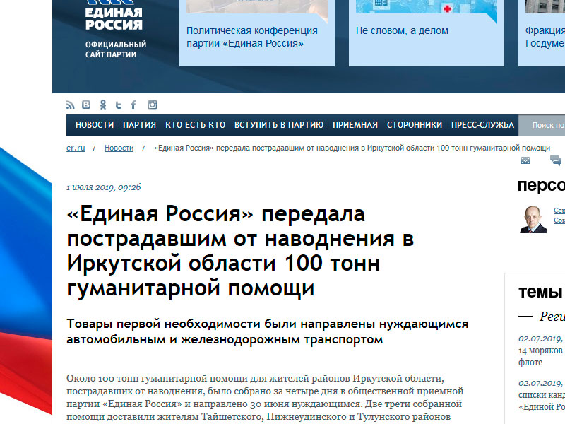 Статья председателя правительства и «Единой России» Дмитрия Медведева предвещает партии грандиозную трансформацию единороссам. Трансформация должна стать гораздо более масштабной, чем «ребрендинг» задуманный Андреем Турчаком. Первое к чему призывает премьер-министр — стать ближе людям, и сделать партийную работу достоянием социальных сетей и прочих коммуникативных сеток. Опережая призыв своего председателя, многие единороссы стали активно «пиарится» на теме трагично известного наводнения в Иркутской области.
