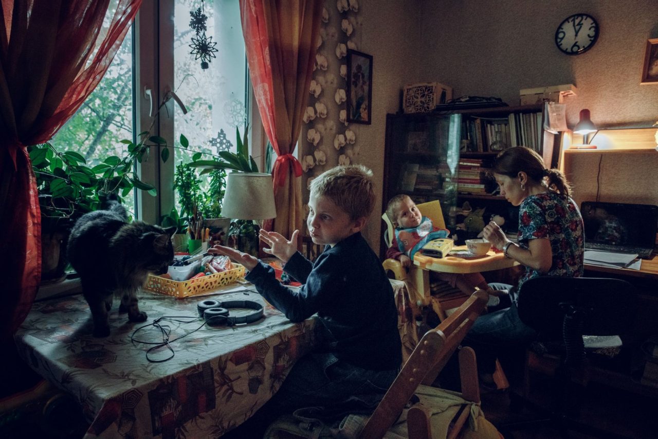 Пока старший брат Боримира Никита несет нам невероятных пластилиновых роботов собственного изготовления, Боримир тоже направляется на кухню — медленно ползет по коридору. На четвереньках у него пока не выходит: он не понимает, как это делается, поэтому изо всех сил толкает и пихает пол руками и ногами, переворачивается с живота на спину, понемногу перемещаясь вперед. Все его подбадривают — и вот он уже тянет руки к папе, по пути нежно погладив стиральную машинку.