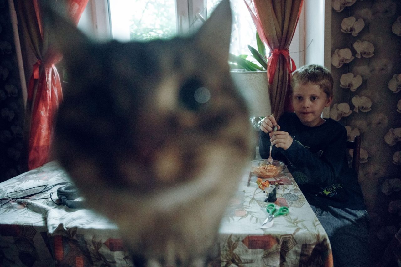 Кот по кличке Кот смотрит в объектив, пока брат Боримира Никита обедает после прогулкиФото: Андрей Любимов для ТД После выписки началось путешествие по педиатрам и неврологам.
