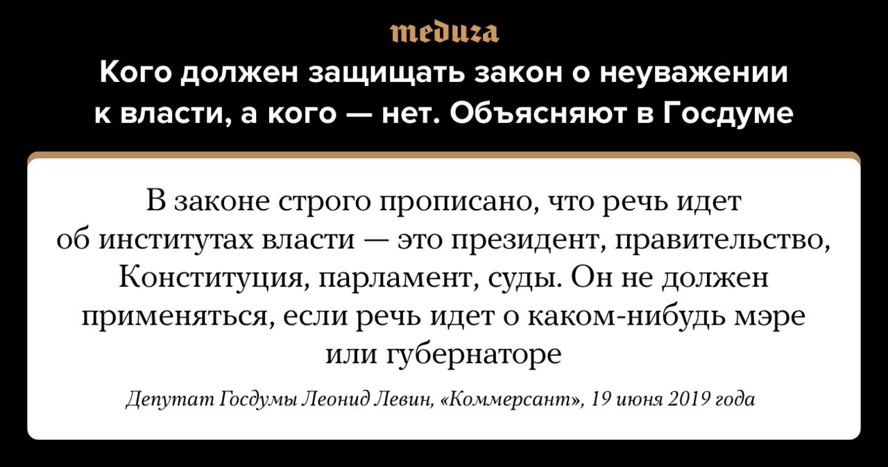 - Глава комитета Госдумы по информационной политике Леонид Левин ранее сообщил, что депутатов беспокоит использование закона о неуважении к власти «местными региональными элитами» «для сведения счетов с общественниками и журналистами».