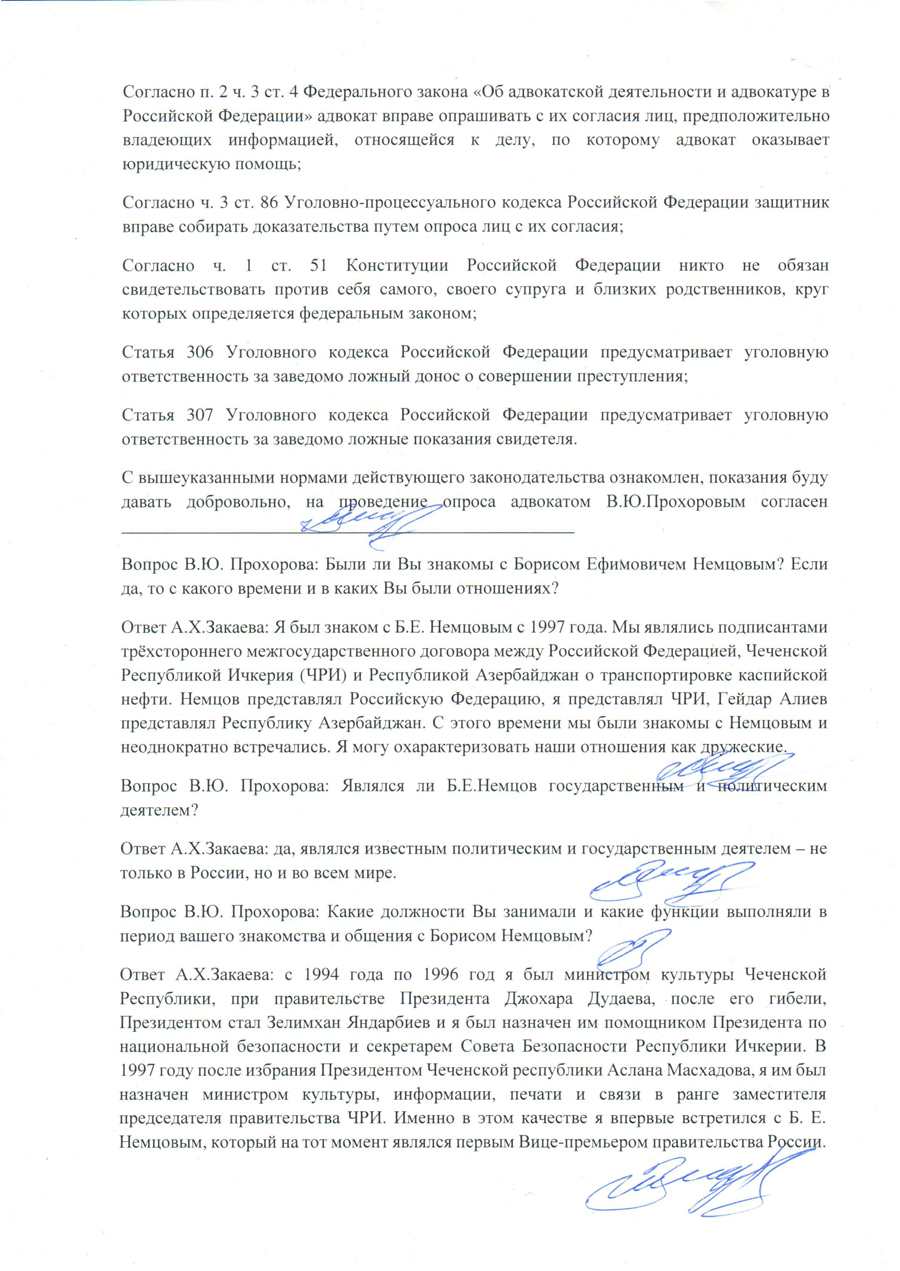Ответ А.Х.Закаева: Я был знаком с Б. Е. Немцовым с 1997 года. Мы являлись подписантами трёхстороннего межгосударственного договора между Российской Федерацией, Чеченской Республикой Ичкерия (ЧРИ) и Республикой Азербайджан о транспортировке каспийской нефти. Немцов представлял Российскую Федерацию, я представлял ЧРИ, Гейдар Алиев представлял Республику Азербайджан. С этого времени мы были знакомы с Немцовым и неоднократно встречались. Я могу охарактеризовать наши отношения как дружеские.