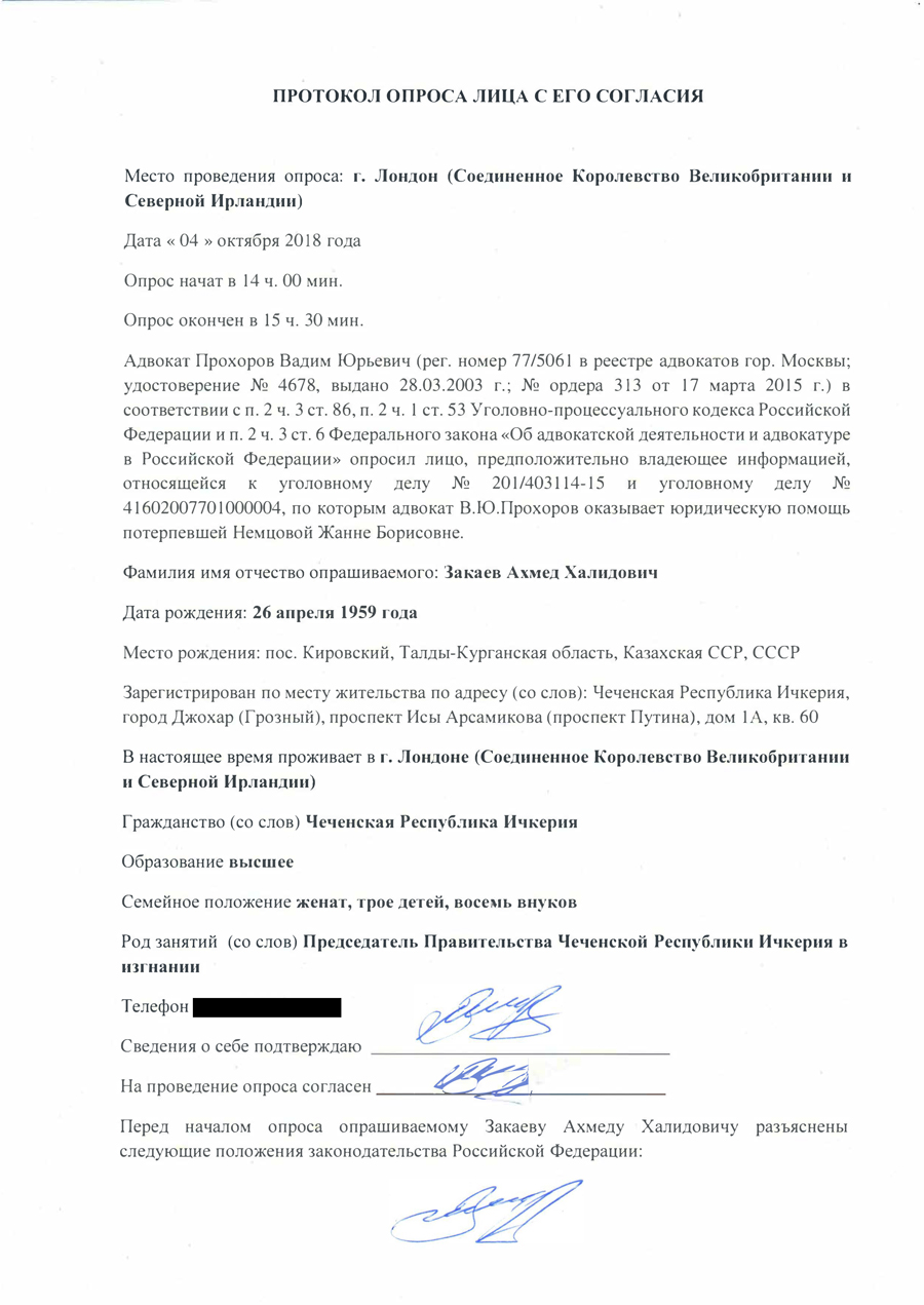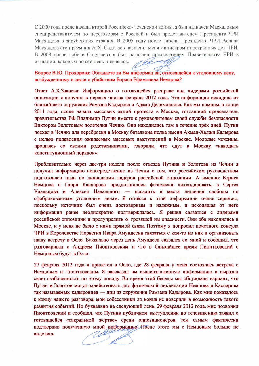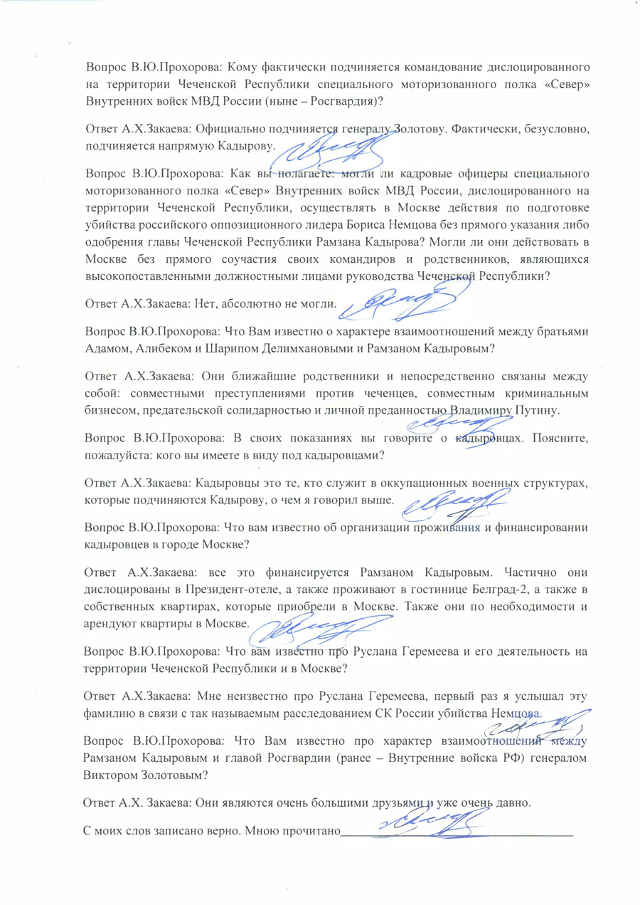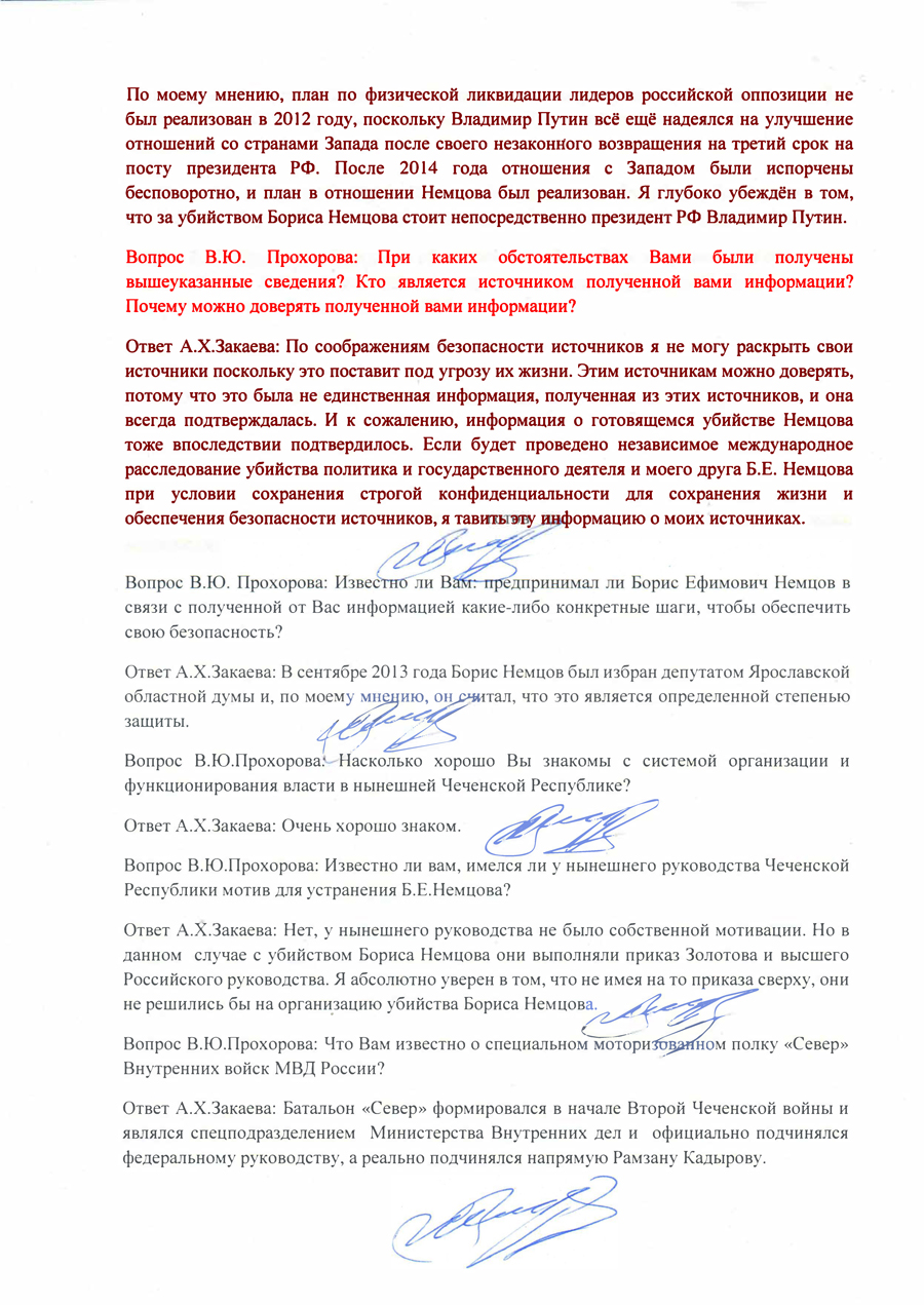 И наконец, самое важное в настоящей публикации: к ней прилагается документ, ранее никогда не публиковавшийся. Впервые в полном объеме он обнародуется на этих слушаниях в Люксембурге при подготовке доклада о расследовании убийства Бориса Немцова. Это протокол опроса бывшего вице-премьера Чечни Ахмеда Закаева в качестве свидетеля, произведенного автором этих строк, адвокатом Вадимом Прохоровым, 04 октября 2018 года в Лондоне. Прошу обратить особое внимание на страницы 3 и 4 этого документа, содержащие важнейшую — с моей точки зрения — информацию. По-моему, во многом содержащиеся в документе сведения расставляют точки над i в этом крайне непростом деле.