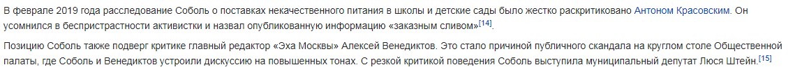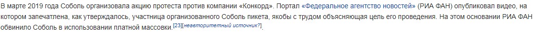 Для своих правок они выбирали определенные СМИ. Для очернения Любови Соболь невозможно использовать «Коммерсантъ», потому что там просто не будет информации. Редакторы ссылались на медиа из пула РИА ФАН, которые принадлежат Пригожину (связывают с «фабрикой троллей» — прим. «Бумаги»).