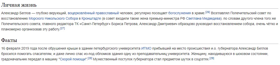 При этом редакторам очень нравился Беглов. Они писали, что при обрушении крыши здания ИТМО врио губернатора сам вывел из-под завалов женщину и передал ее скорой помощи (преподавательница отрицала, что Беглов ее спас — прим. «Бумаги»). Беглова также называли глубоко верующим, воцерковленным православным человеком, который регулярно посещает богослужения в храме.