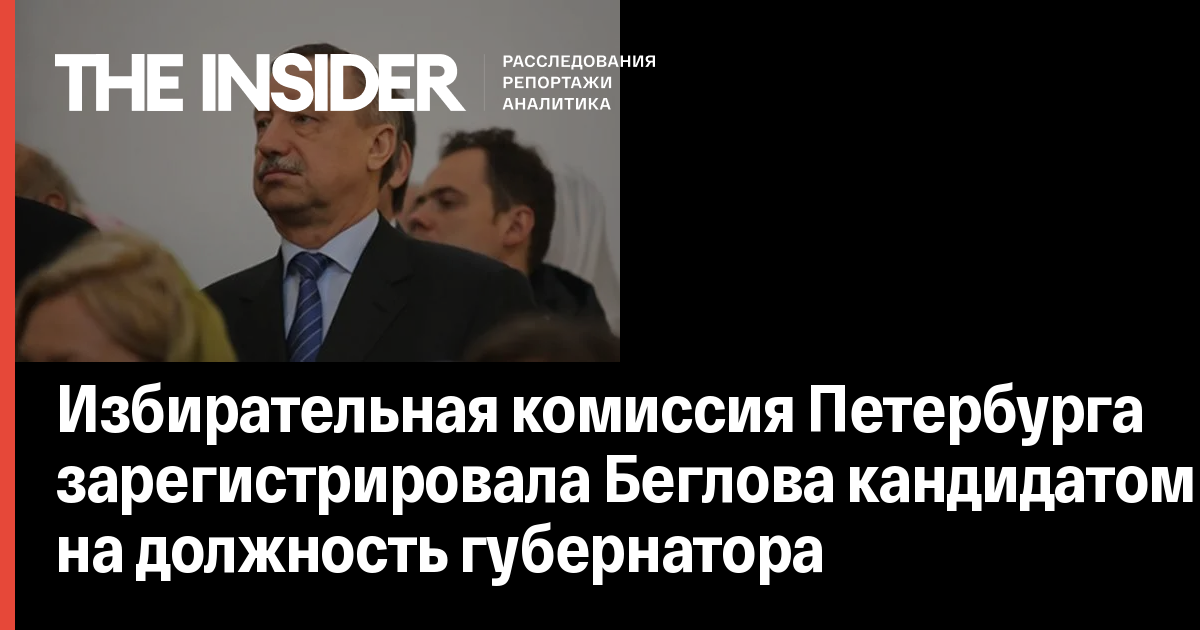 Беглов подал документы как самовыдвиженец. В конце июня он сдал в горизбирком 162 подписи из 108 муниципальных округов, а также 80 тысяч 331 подпись избирателей для регистрации кандидатом (подробнее о биографии Беглова читайте в материале The Insider Губернатор-тролль. Как Пригожин и Ковальчук делают из Беглова главу Санкт-Петербурга).