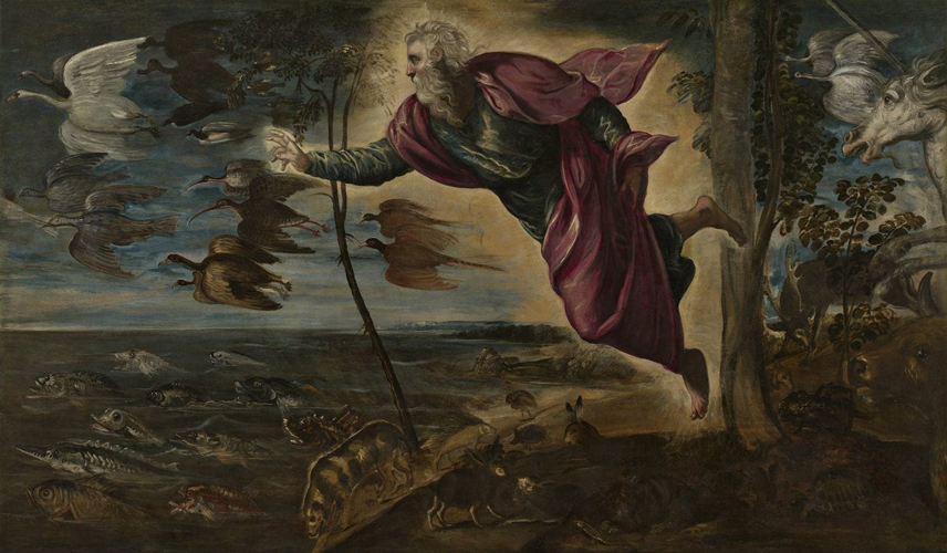 Один из важнейших разделов наследия Тинторетто — изображения классических библейских сюжетов. Выдающееся достижение раннего периода его творчества — полотно «Сотворение животных», которое запоминается насыщенной, бурной и оживленной композицией. От фигуры Творца, окруженной пламенным светом, начинают движение птицы и рыбы, словно стрелы, вылетая из его рук и следуя указанному им направлению. Холст пересекают бегущие олени, быки и даже упоминаемый в Библии единорог. Сосредоточившись на образах животных, Тинторетто не так много внимания уделил пейзажу: здесь он играет роль второстепенную, расставляя лишь смысловые доминанты в границах между небом, сушей и водой (линия горизонта, береговая линия и дерево, написанные легкими, быстрыми мазками). Эти три стихии являют собой на полотне три отдельных мира, которые сходятся в одной точке — в изображении их создателя, отсылающем к фигуре Бога в «Сотворении Адама» Микеланджело с потолка Сикстинской капеллы.