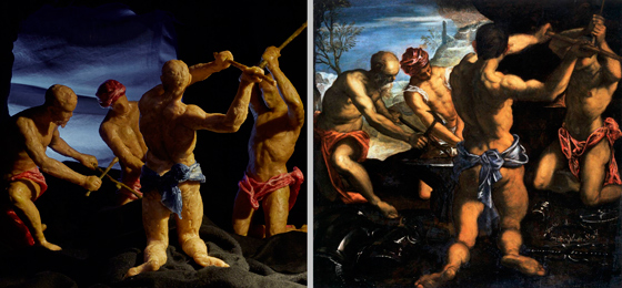 Слева: Кристина Алаймо, Федерика Каваллин. Копия восковой модели Тинторетто к картине «Кузница Вулкана». 2018. Пчелиный воск, шелк, деревянная коробка © Cristina Alaimo / Справа: Якопо Тинторетто. Кузница Вулкана. 1577. Холст, масло © Дворец дожей, Венеция Муза, летящая слева, напомнила итальянскому художнику и биографу Карло Ридольфи позу, воплощенную Джованни Джамболоньей в бронзовой скульптуре «Геркулес и Лихас». Этот случай не единичный: Тинторетто зачастую опирался в рисунке на пластику статуй и делал миниатюрные модели скульптур Микеланджело из воска или глины. Он следовал своему собственному методу, который описал другой биограф — Марко Боскини, а кураторы выставки воссоздали в отдельном зале. Тинторетто драпировал свои восковые фигуры, подвешивал их в ящиках и устанавливал свет. Затем он делал наброски углем на квадрированных листах и переносил в увеличенном виде на холст с помощью сетки.