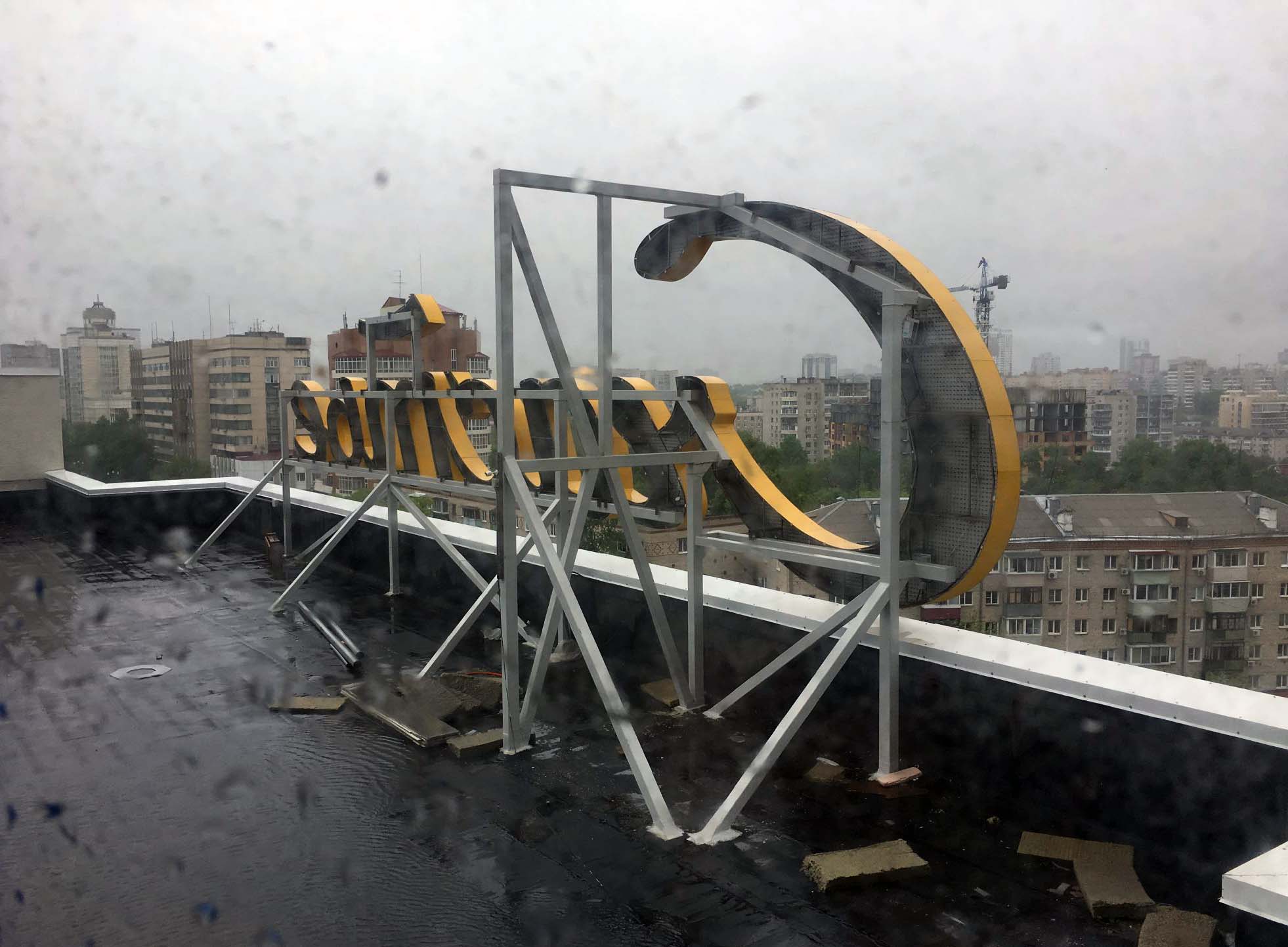 Сегодня уже практически готовый торгово-офисный центр стоит пустым. На его крыше установлена огромная желтая надпись: «Счастье».