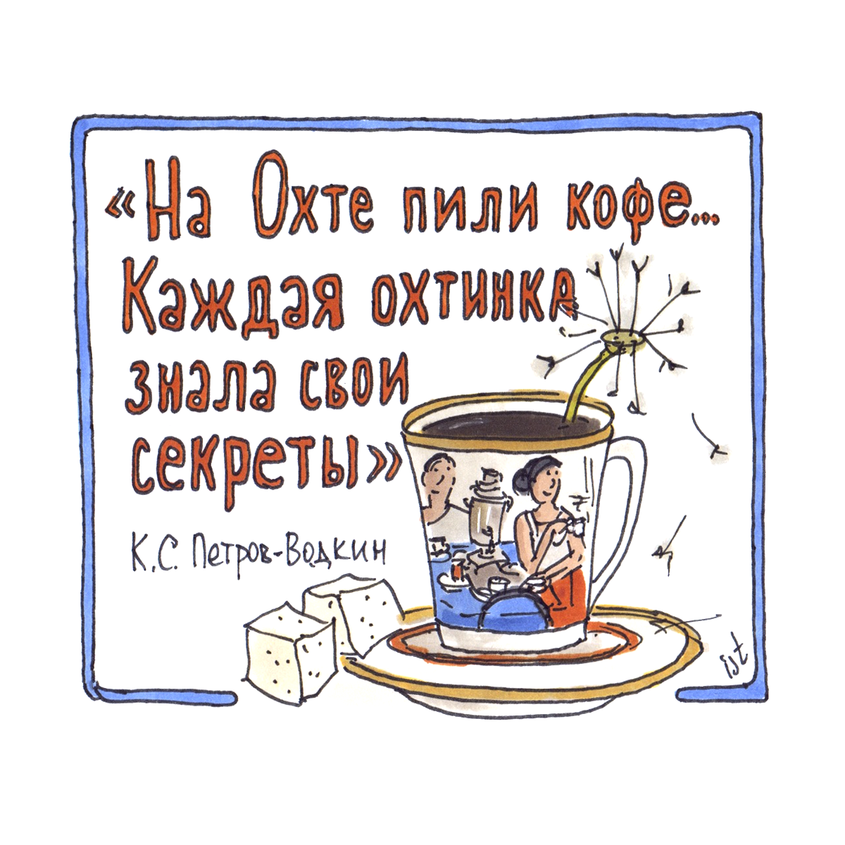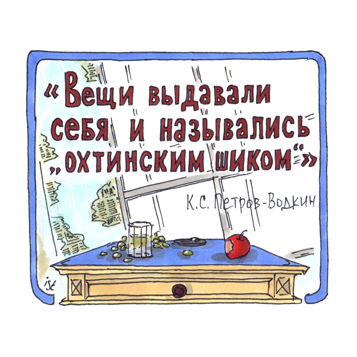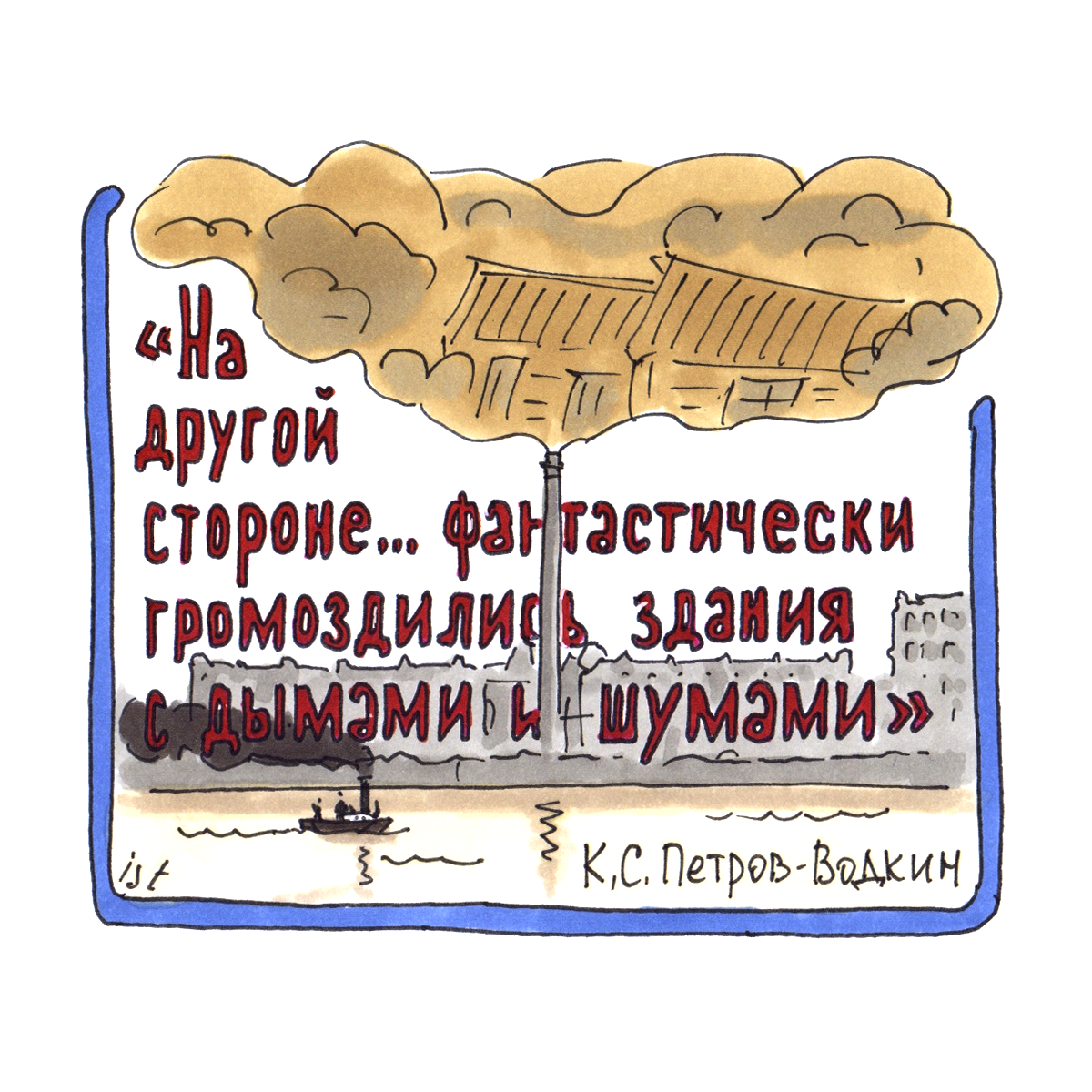 Иллюстрации Илья Тихомиров подготовил для проекта с маршрутами для прогулок Krasnakarta. Один из маршрутов разработан на основе двух посвященных Охте глав из автобиографической повести Петрова-Водкина «Хлыновск».