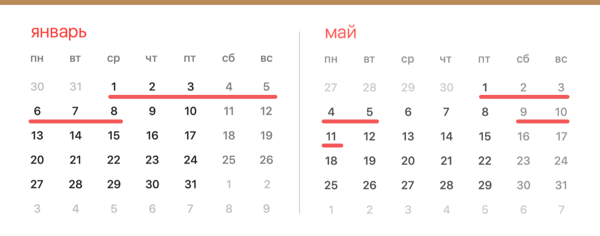 Правительство России утвердило постановление о переносе выходных и праздничных дней в 2020 году. Выходные 4 и 5 января, совпадающие с нерабочими праздничными днями, перенесли на 4 и 5 мая. Таким образом, в Новый год будет восемь выходных, а весной выходными будут 1 — 5 мая и 9 — 11 мая.