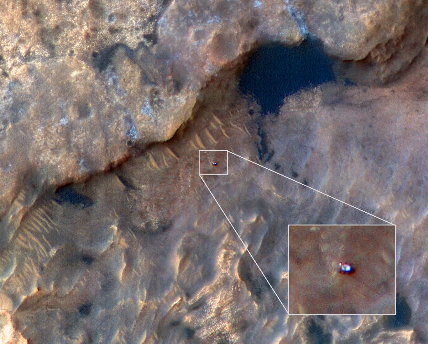 Марсоход «Кьюриосити» сфотографировали с орбиты Марса. Сможете найти его на фото?