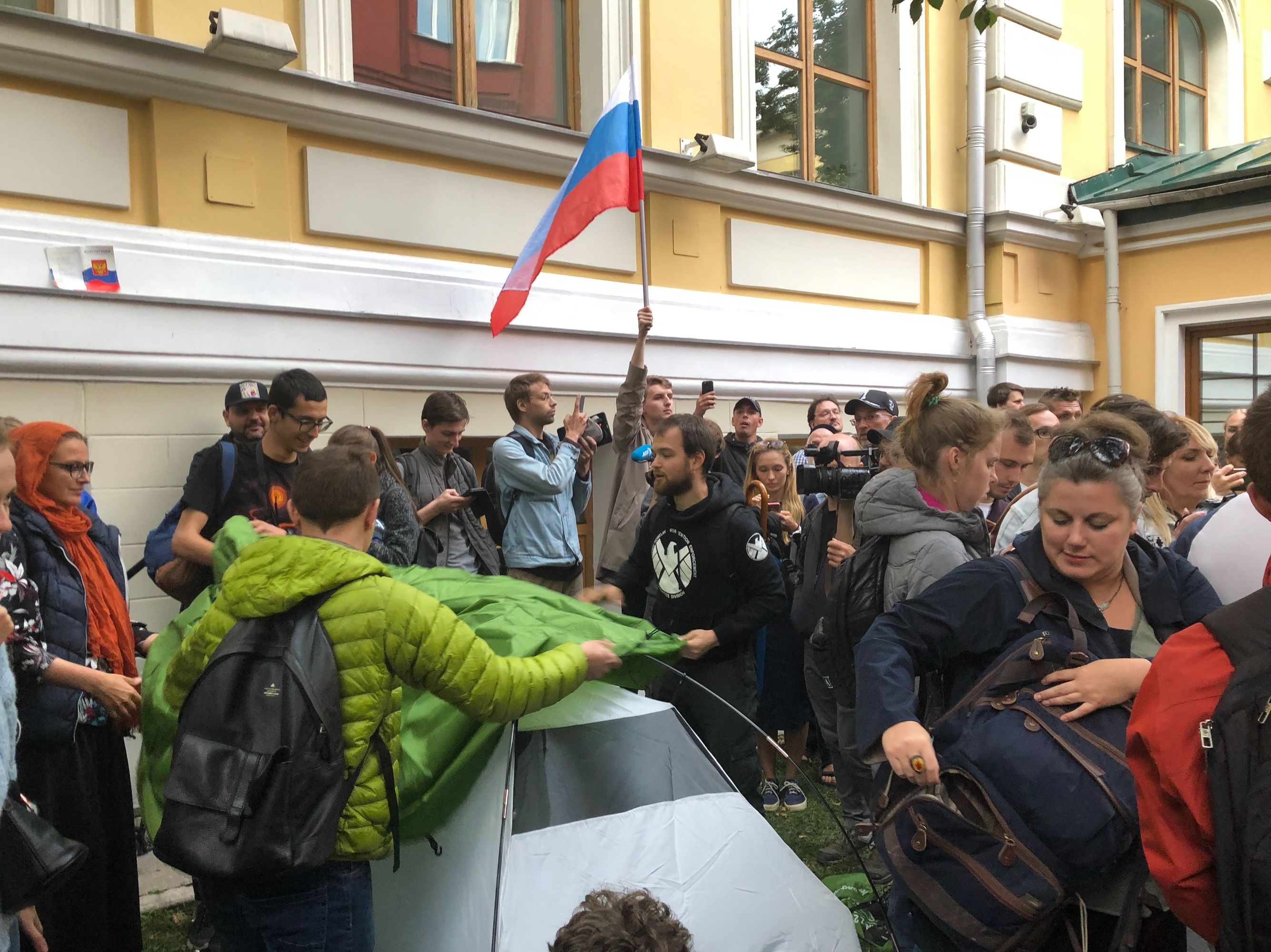 Протестующие, которые требуют допустить до выборов в Мосгордуму оппозиционных и независимых кандидатов, начали ставить палатки во дворе здания городской избирательной комиссии.